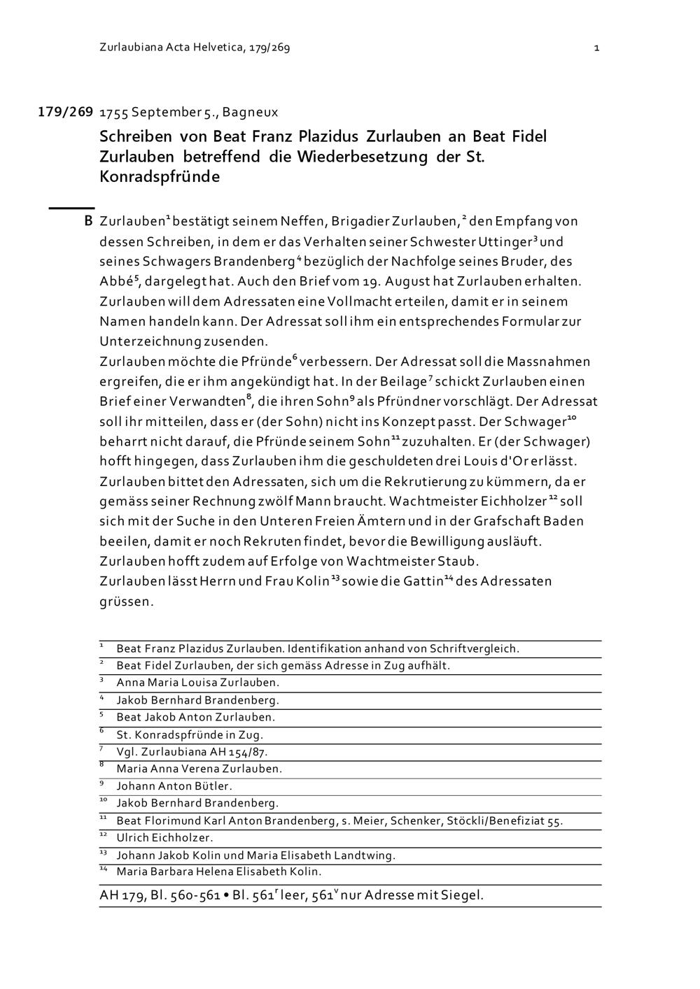 Schreiben von Beat Franz Plazidus Zurlauben an Beat Fidel Zurlauben betreffend die Wiederbesetzung der Sankt-Konradspfrund