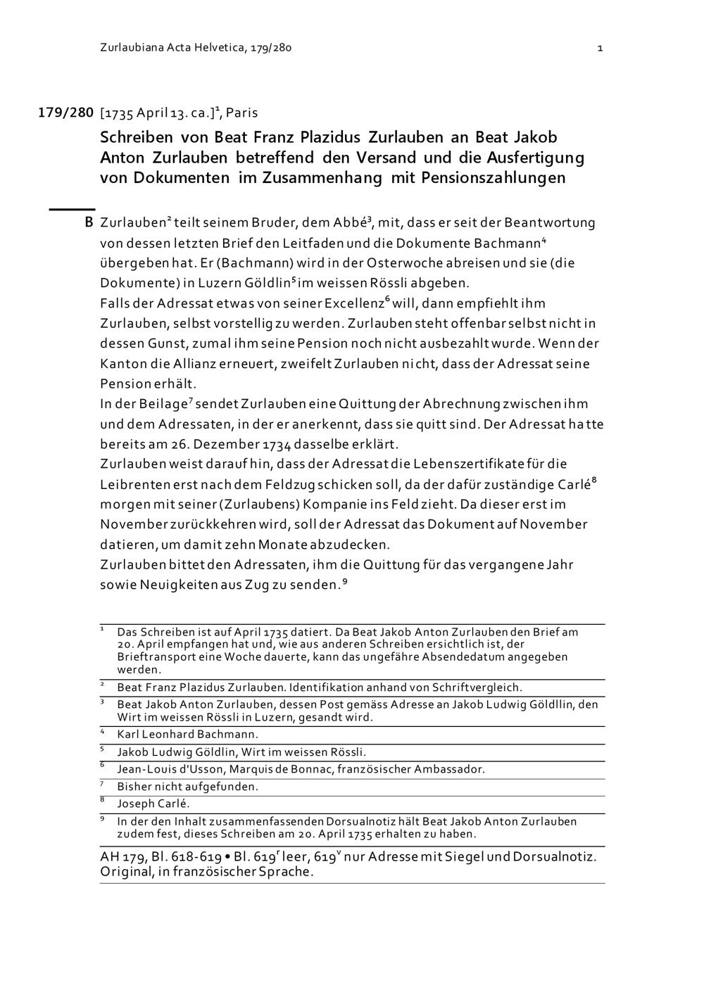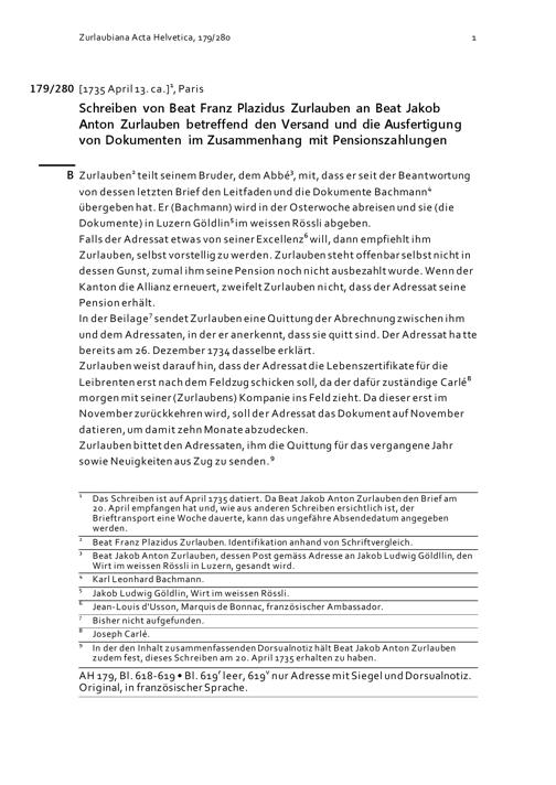 Schreiben von Beat Franz Plazidus Zurlauben an Beat Jakob Anton Zurlauben betreffend den Versand und die Ausfertigung von Dokumenten in Zusammenhang mit Pensionszahlungen