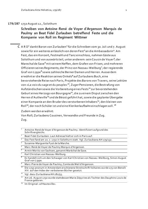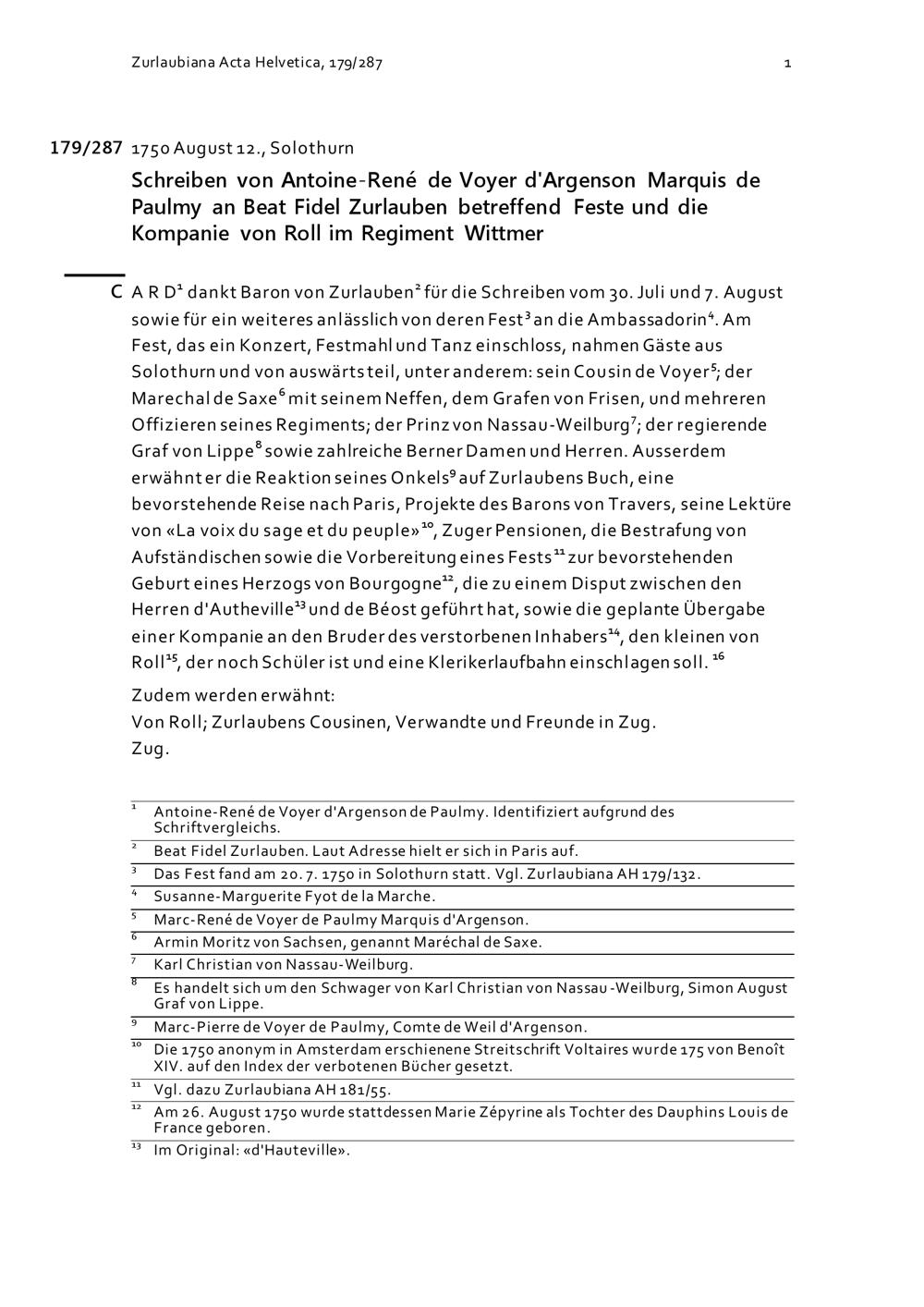 Schreiben von Antoine-René de Voyer d'Argenson, Marquis de Paulmy, an Beat Fidel Zurlauben betreffend Feste und die Kompanie von Roll im Regiment Widmer