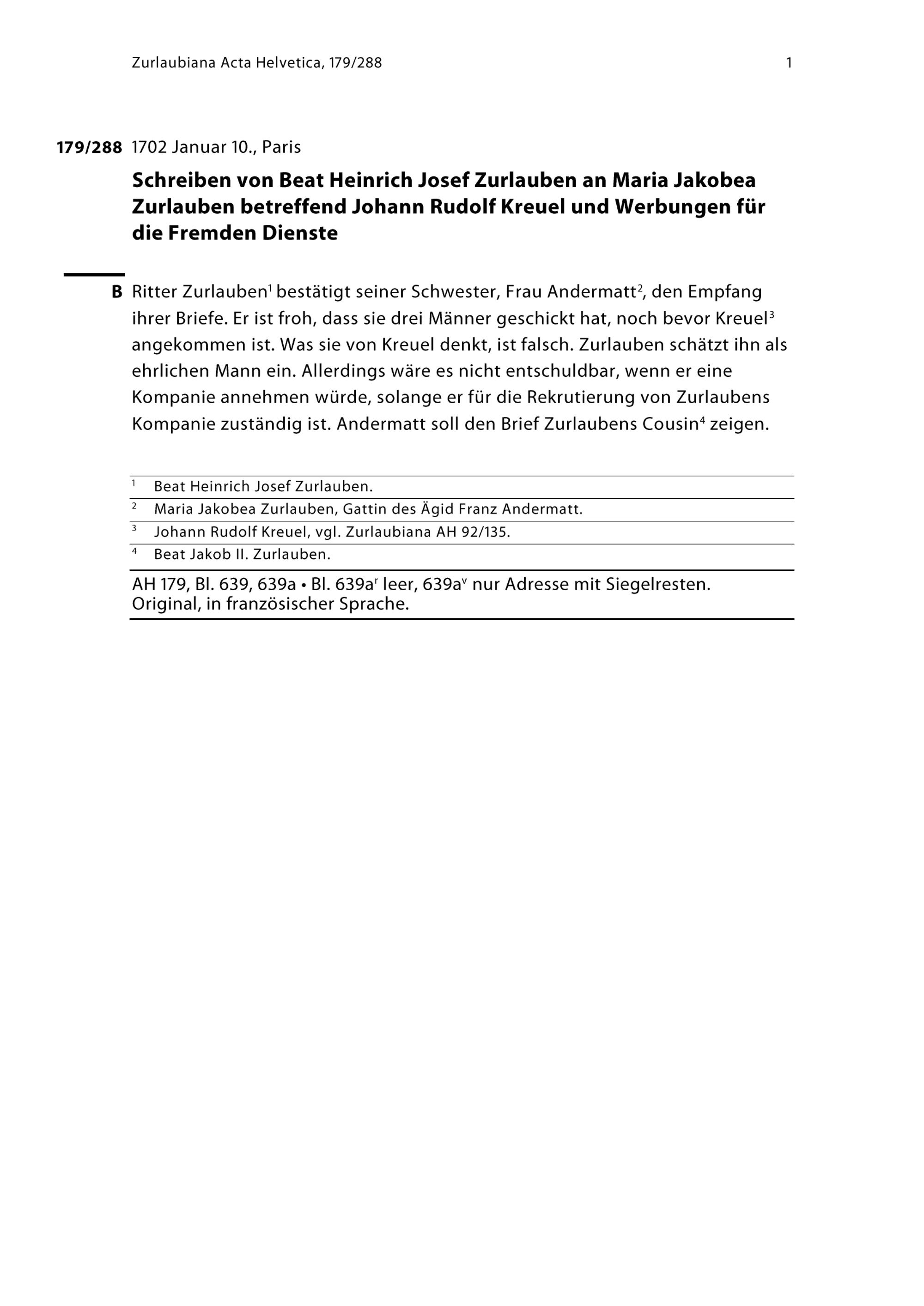 Schreiben von Beat Heinrich Josef Zurlauben an Maria Jakobea Zurlauben betreffend Johann Rudolf Kreuel und Werbungen für die Fremden Dienste