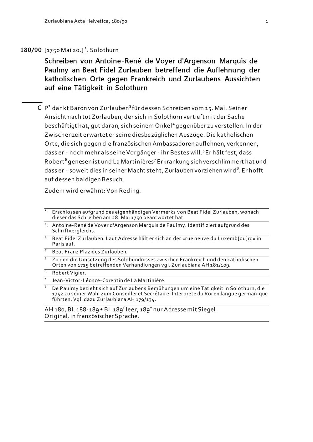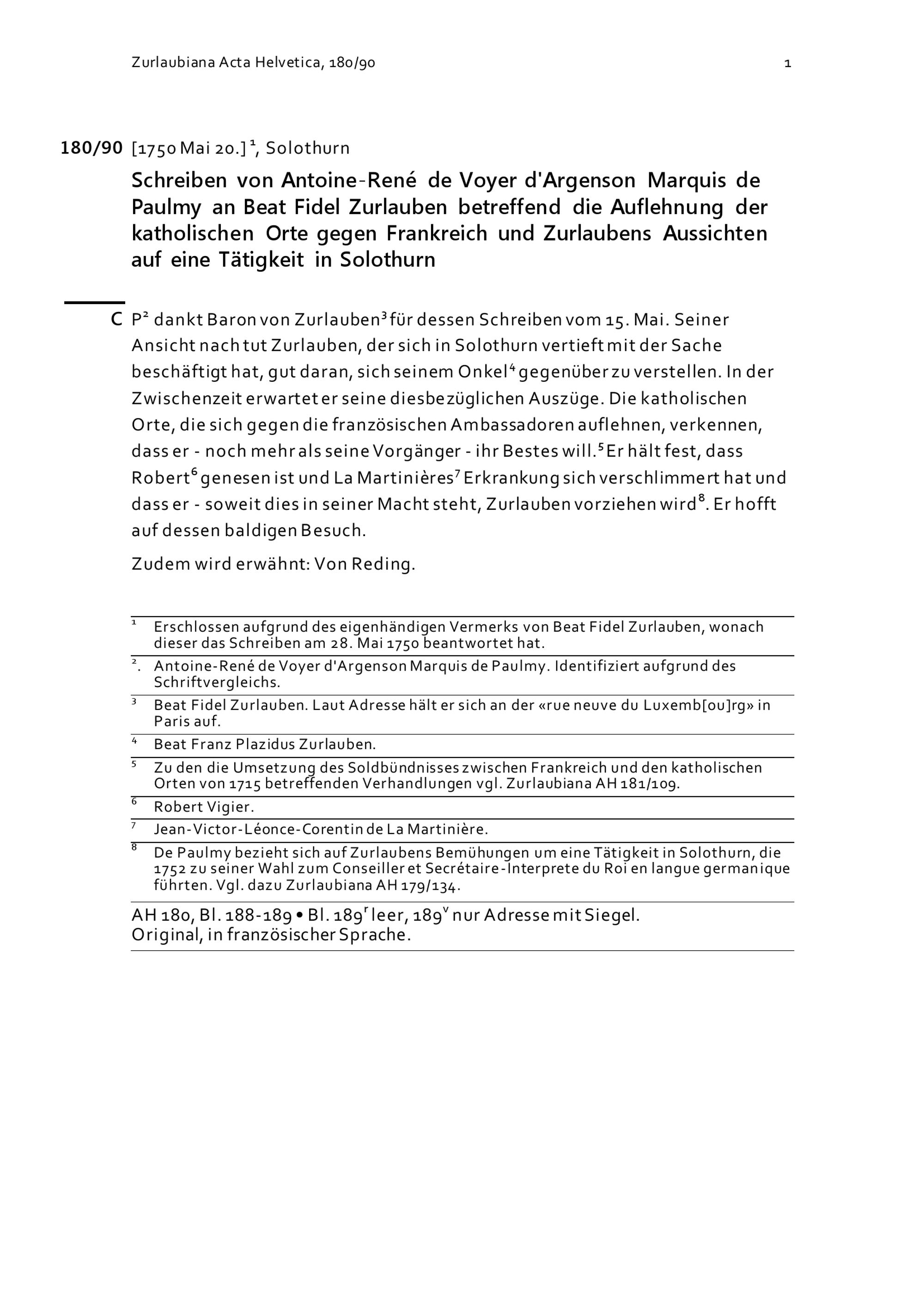 Schreiben von Antoine-René de Voyer d'Argenson, Marquis de Paulmy, an Beat Fidel Zurlauben betreffend die Auflehnung der Katholischen Orte gegen Frankreich und Zurlaubens Aussichten auf eine Tätigkeit in Solothurn