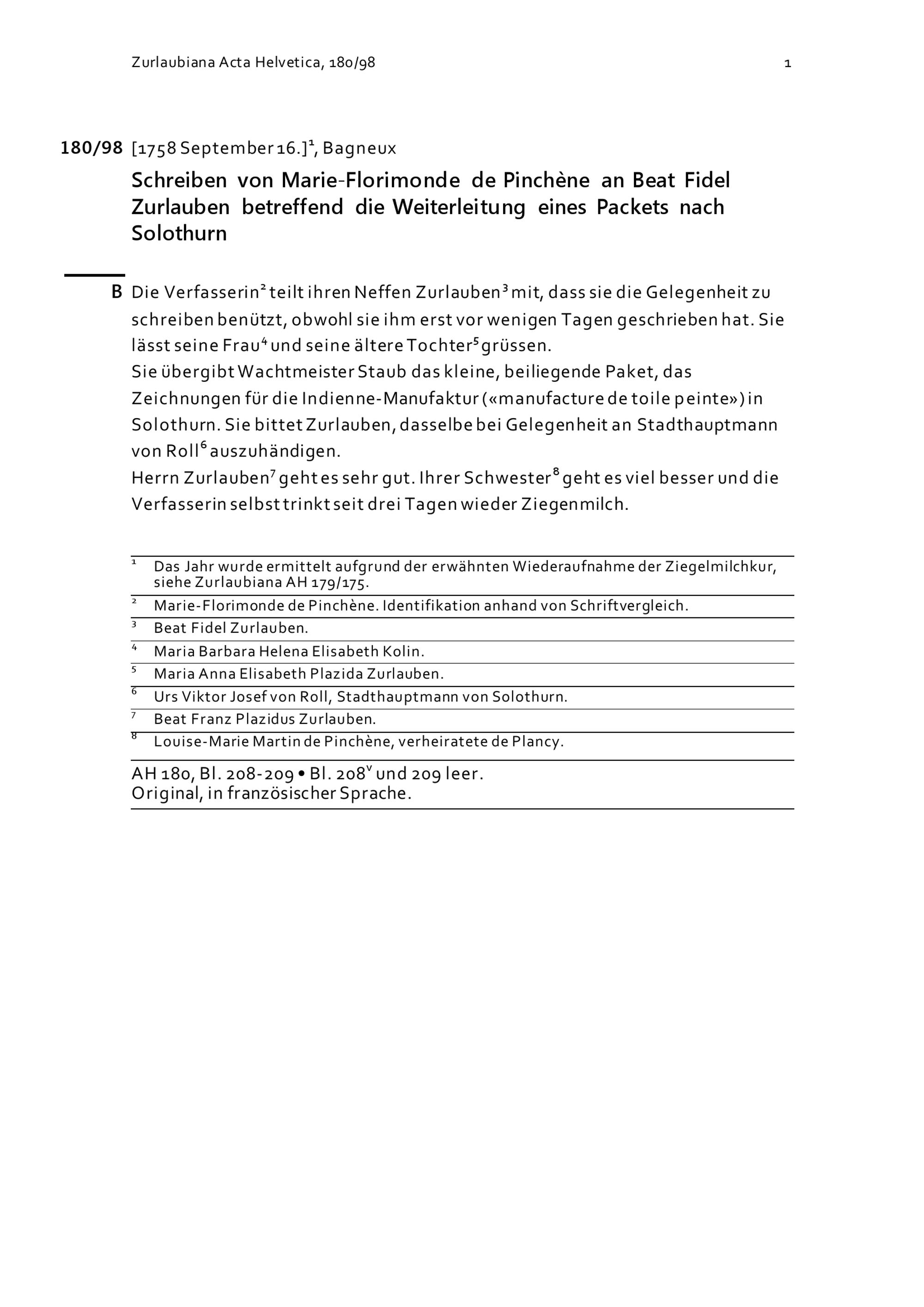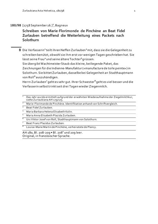 Schreiben von Marie-Florimonde de Pinchène an Beat Fidel Zurlauben betreffend die...