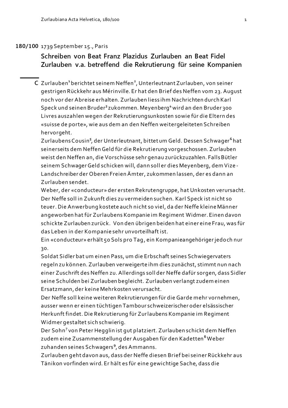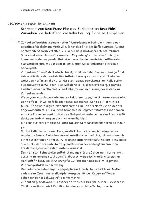 Schreiben von Beat Franz Plazidus Zurlauben Beat Fidel Zurlauben v.a. betreffend die Rekrutierung für seine Kompanien