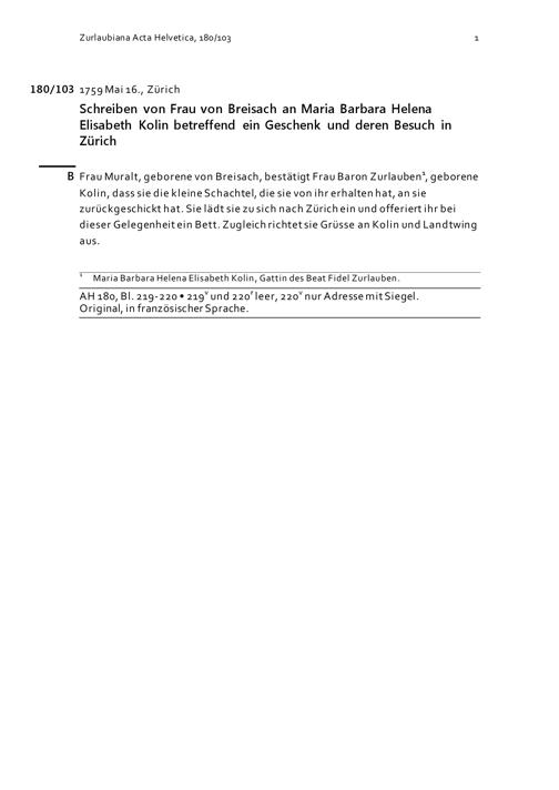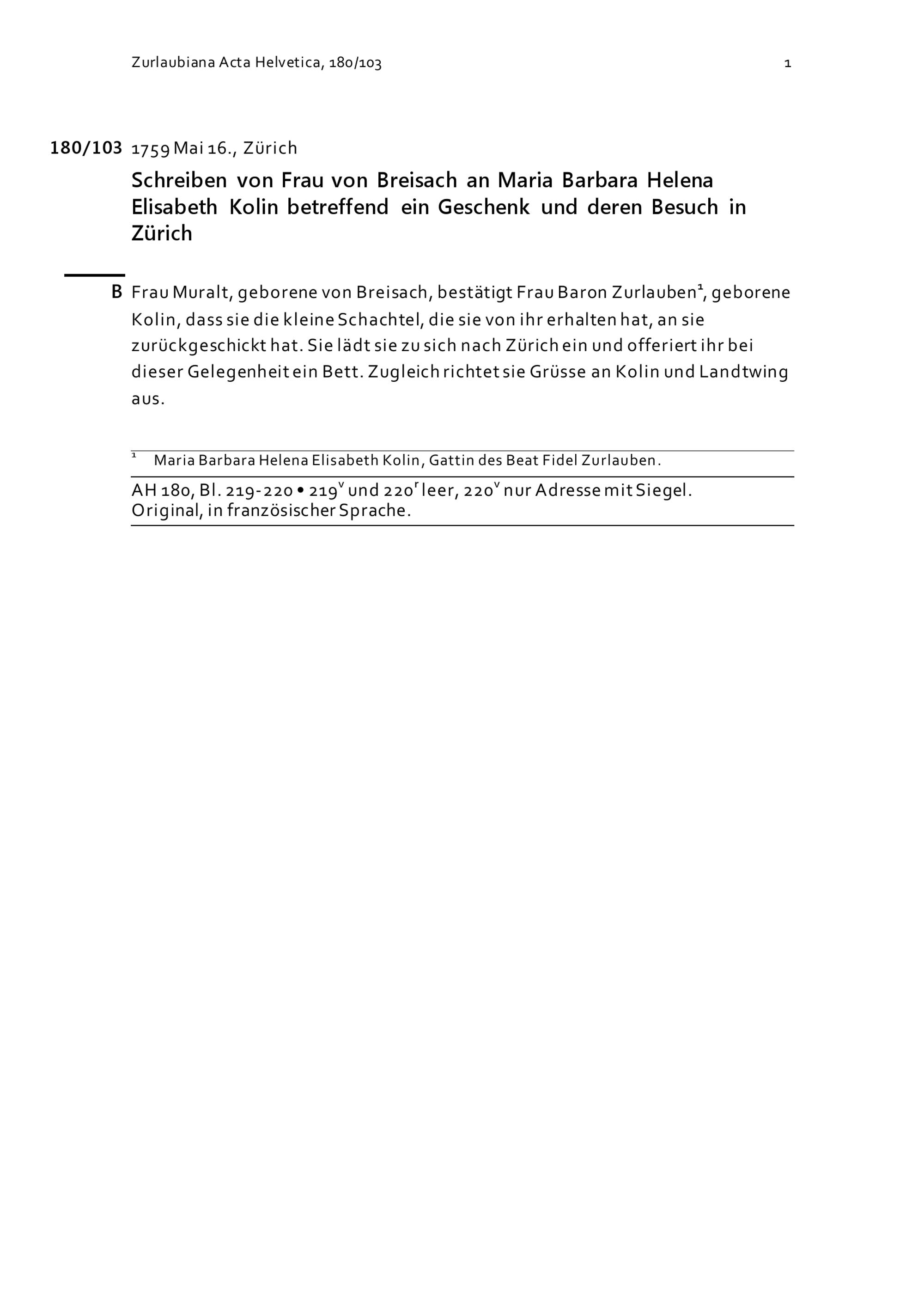 Schreiben von Frau von Breisach an Maria Barbara Helena Elisabeth Kolin betreffend ein Geschenk und deren Besuch in Zürich