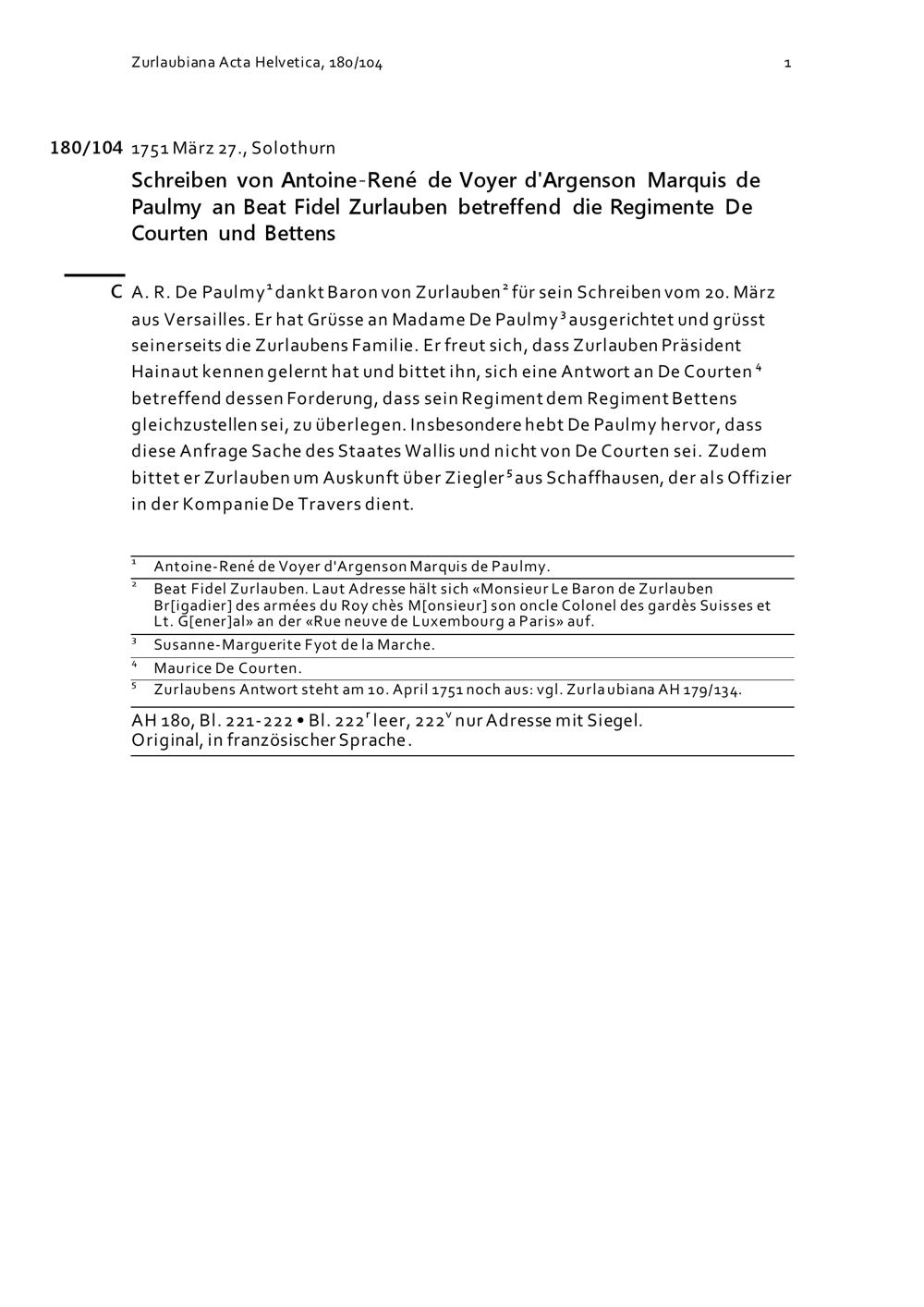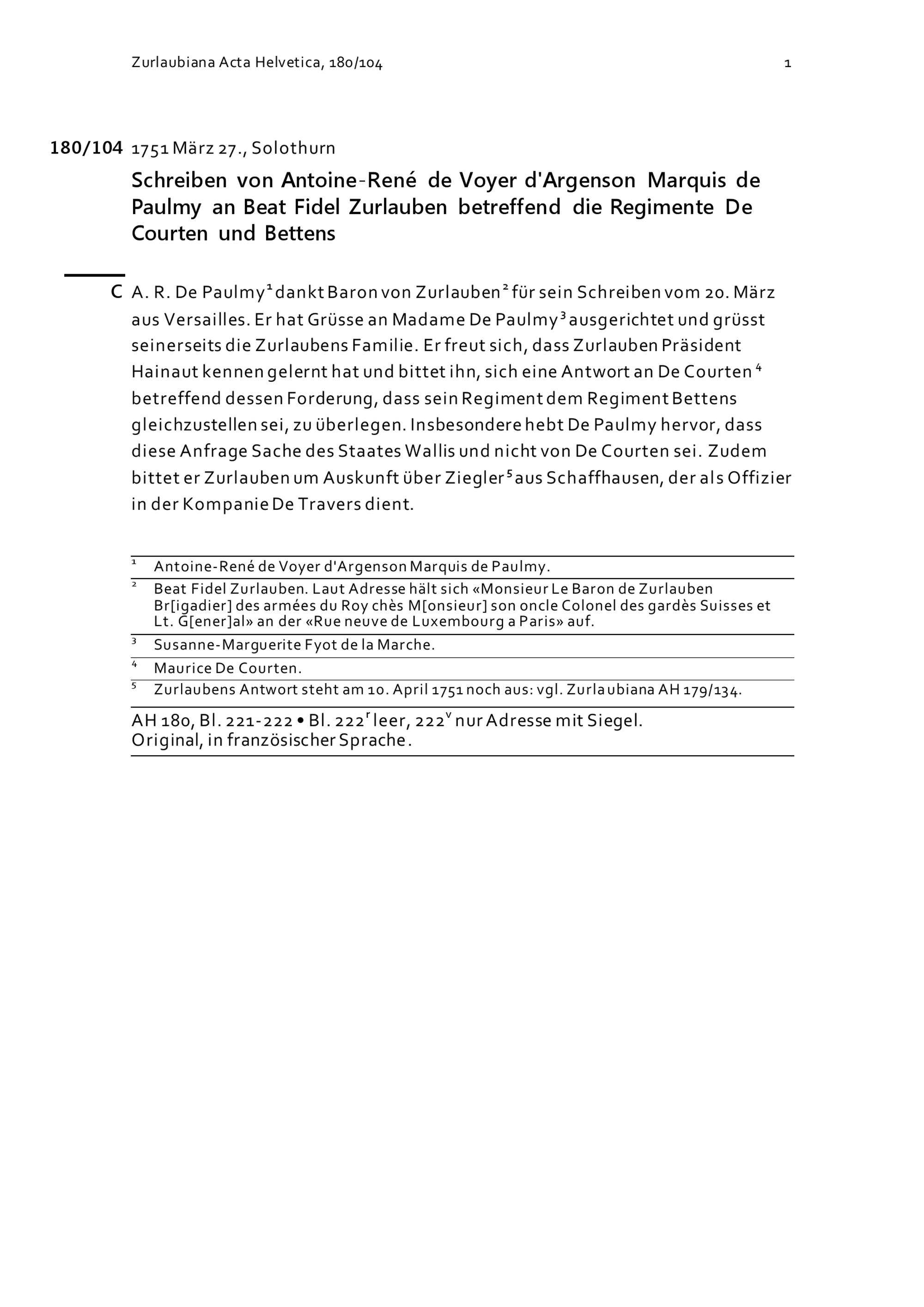 Schreiben von Antoine-René de Voyer d'Argenson, Marquis de Paulmy, an Beat Fidel Zurlauben betreffend die Regimente De Courten und Bettens