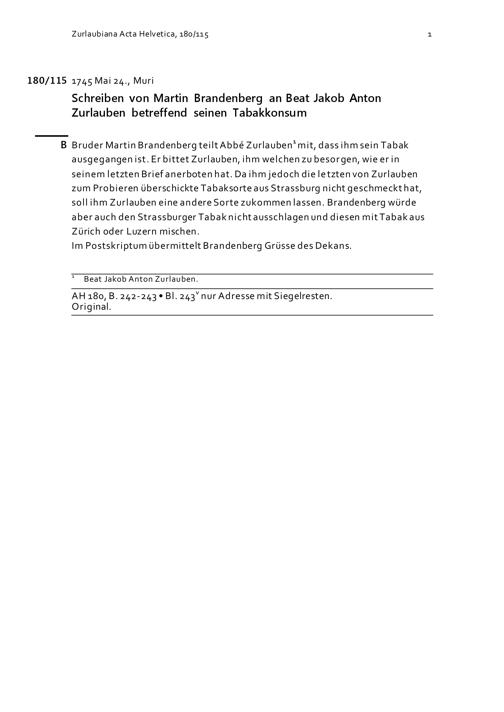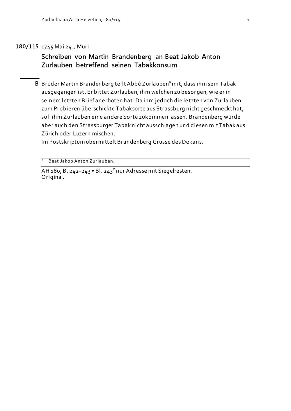 Schreiben Martin Brandenberg an Beat Jakob Anton Zurlauben betreffend seinen Tab...