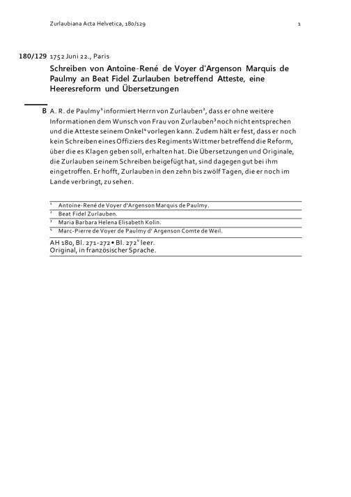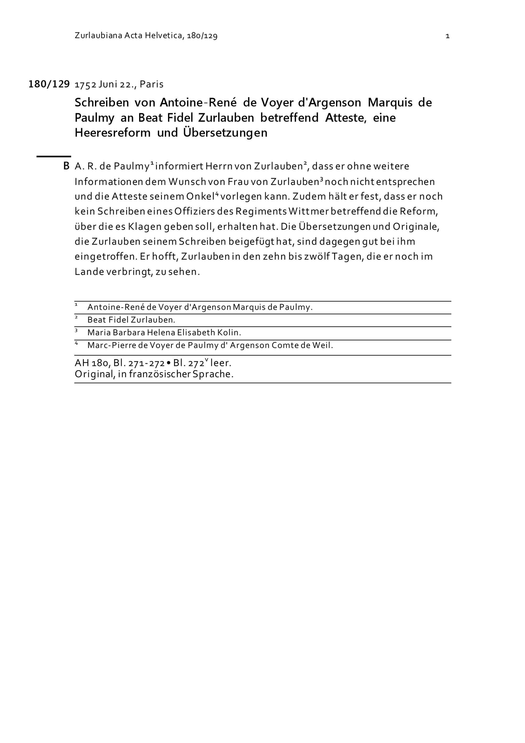 Schreiben von Antoine-René de Voyer d'Argenson, Marquis de Paulmy, an Beat Fidel Zurlauben betreffend Atteste, eine Heeresreform und Übersetzungen