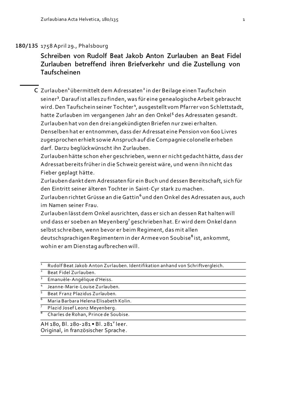 Schreiben von Rudolf Beat Jakob Anton Zurlauben an Beat Fidel Zurlauben betreffend...