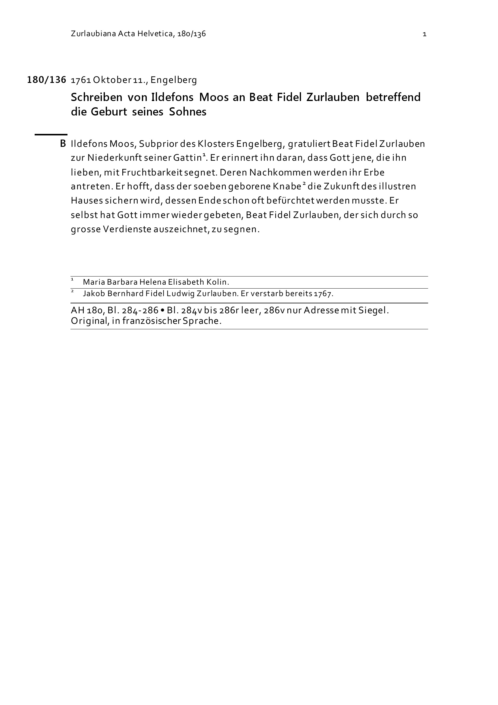 Schreiben von Ildefons Moos an Beat Fidel Zurlauben betreffend die Geburt seines Sohns