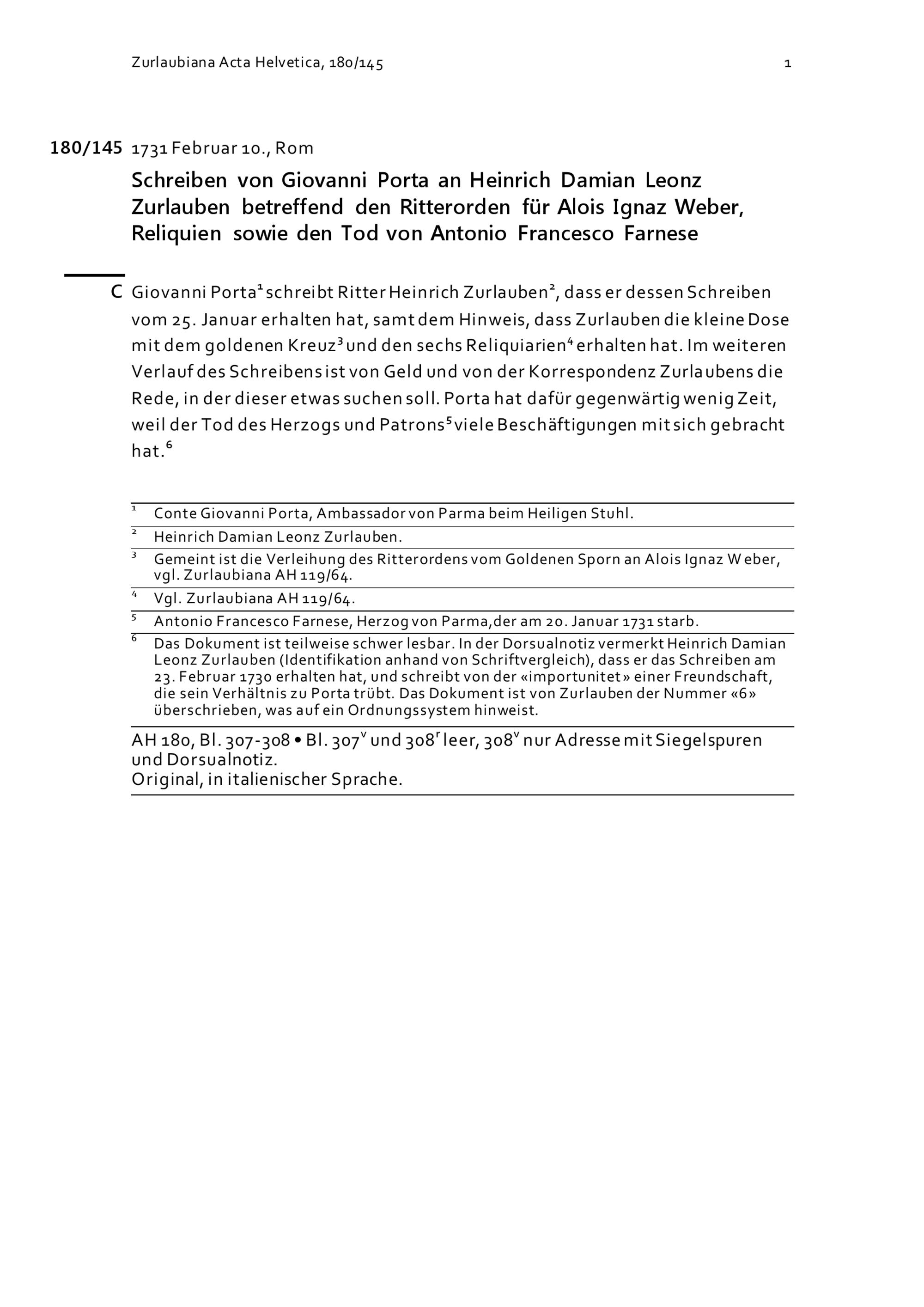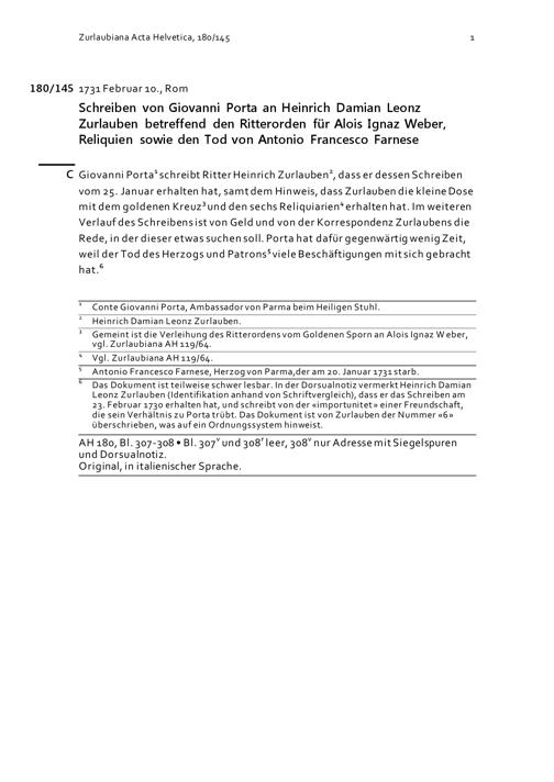 Schreiben von Giovanni Porta, Ambassador von Parma beim Heiligen Stuhl, an Heinrich Damian Leonz Zurlauben betreffend den Ritterorden für Alois Ignaz Weber, Reliquien sowie den Tod von Antonio Francesco Farnese, Herzog,