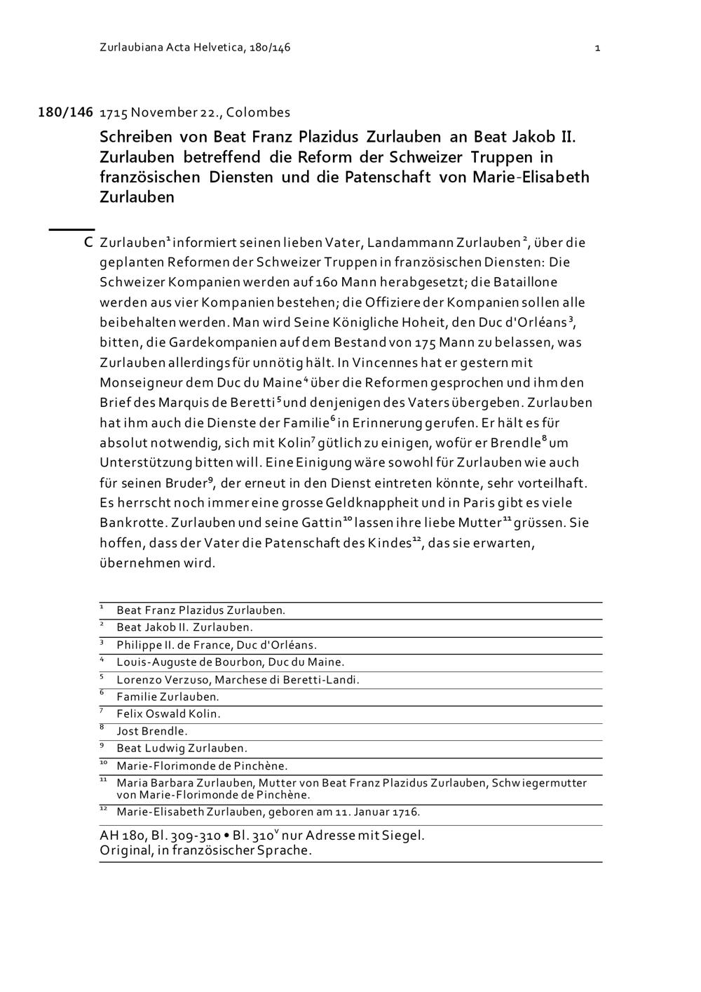 Schreiben von Beat Franz Plazidus Zurlauben an Beat Jakob II. Zurlauben betreffend die Reform der Schweizer Truppen in französischen Diensten und die Patenschaft von Marie-Elisabeth Zurlauben
