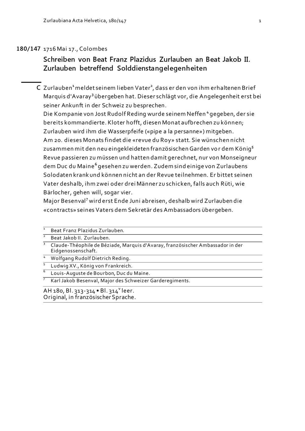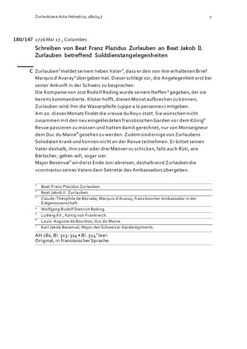 Schreiben von Beat Franz Plazidus Zurlauben an Beat Jakob II. Zurlauben betreffend Solddienstangelegenheiten