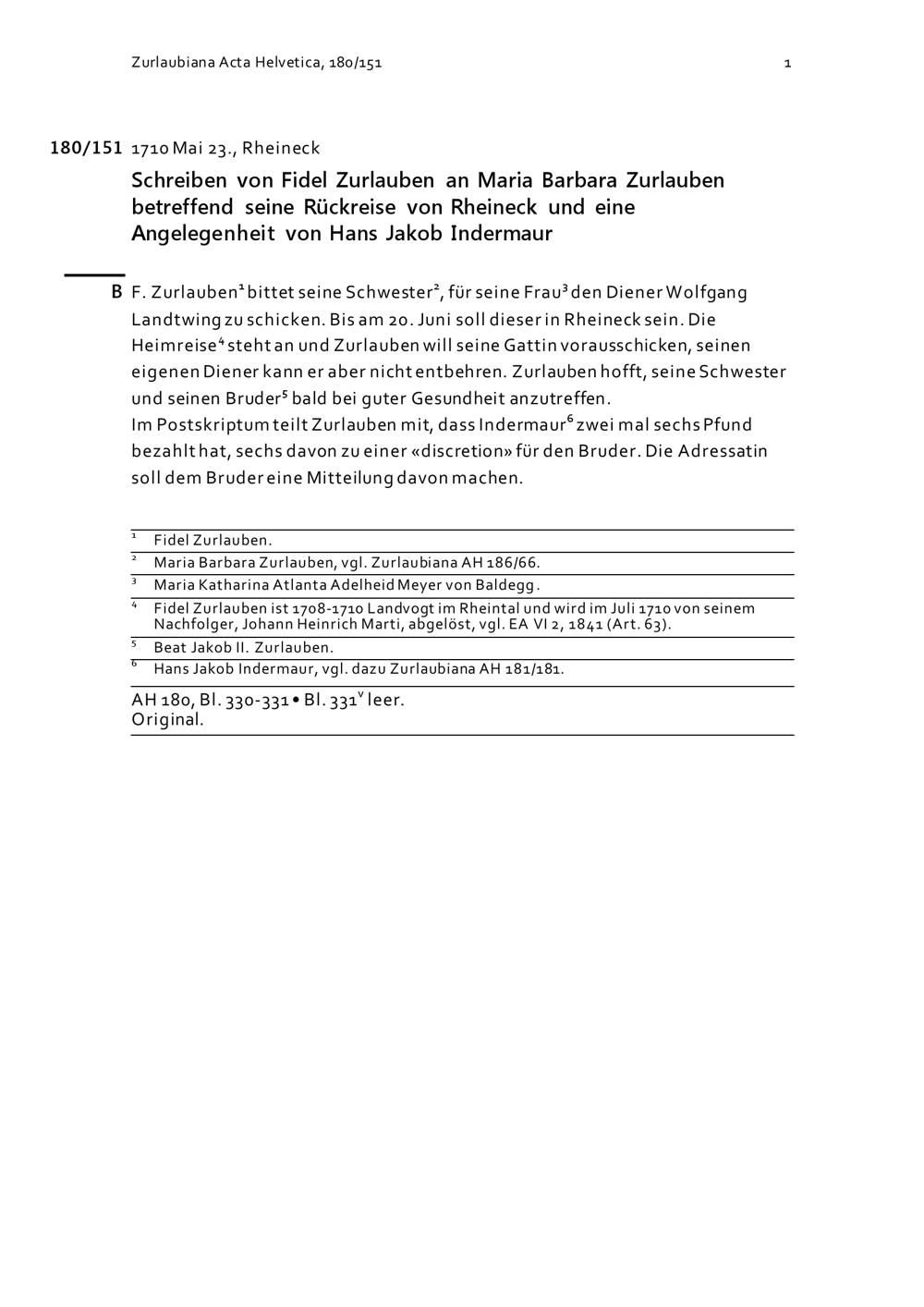 Schreiben von Fidel Zurlauben an Maria Barbara Zurlauben betreffend seine Rückreise von Rheineck und eine Angelegenheit von Hans Jakob Indermaur