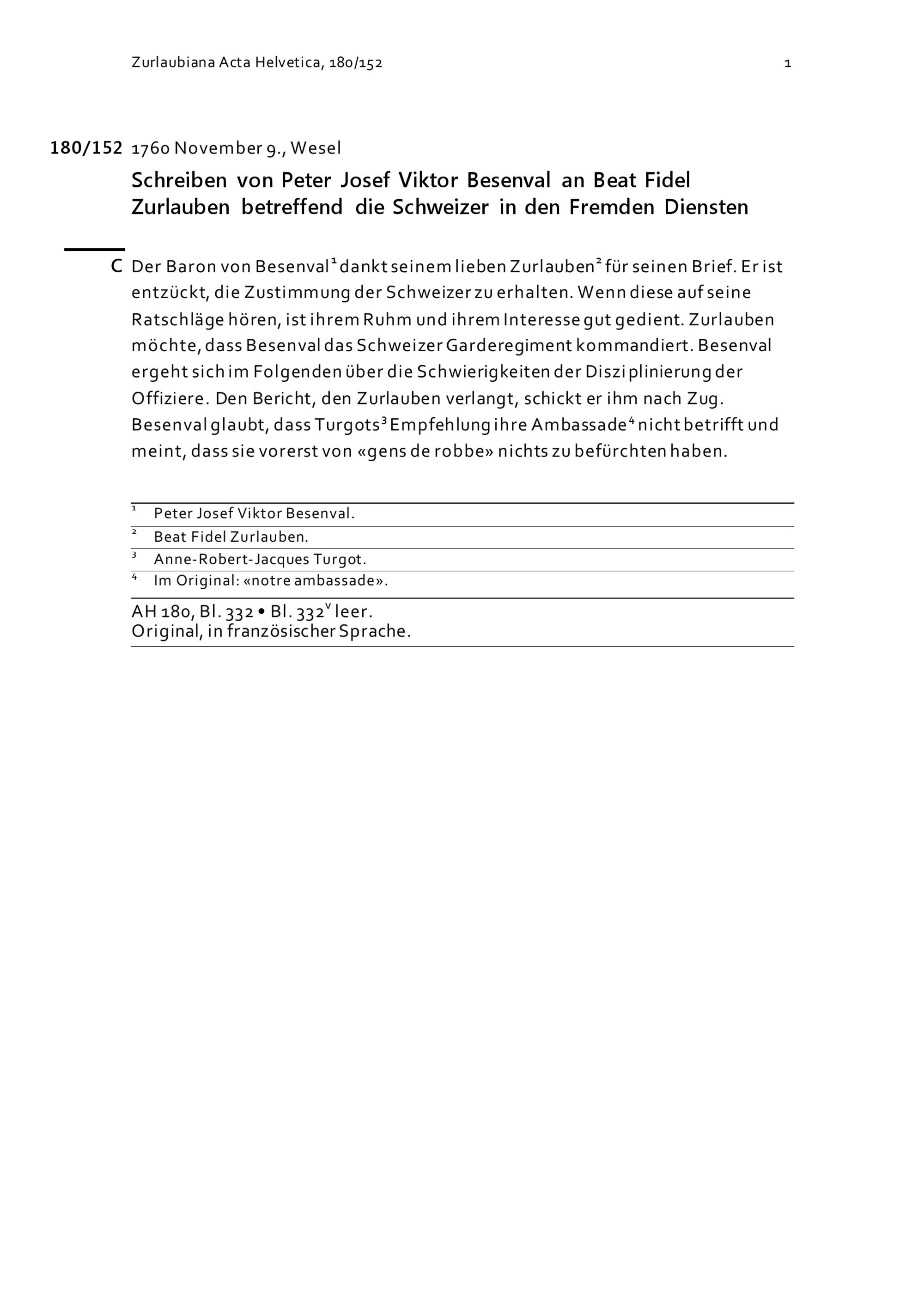 Schreiben von Peter Josef Viktor Besenval an Beat Fidel Zurlauben betreffend die Schweizer in den Fremden Diensten