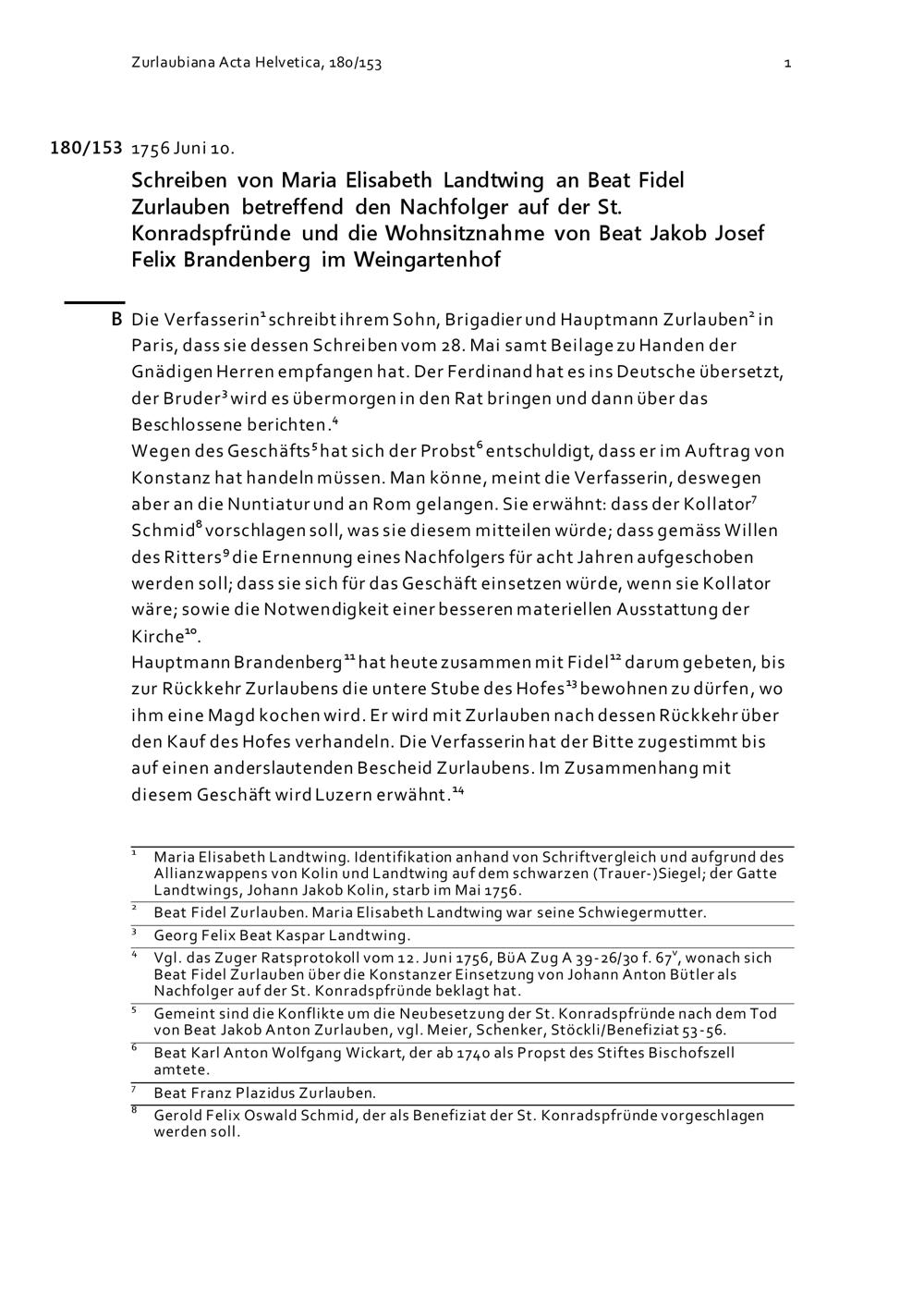 Schreiben von Maria Elisabeth Landtwing an Beat Fidel Zurlauben betreffend den Nachfolger auf der Sankt-Konradspfrund und die Wohnsitznahme von Beat Jakob Josef Felix Brandenberg im Weingartenhof