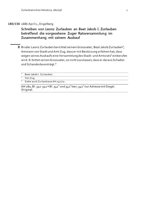 Schreiben von Leonz Zurlauben an Beat Jakob I. Zurlauben betreffend die vorgesehene Zuger Ratsversammlung in Zusammenhang mit seinem Auskauf