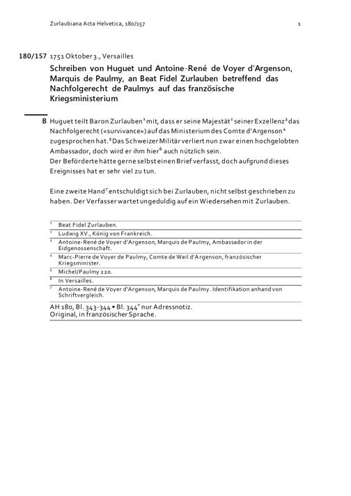 Schreiben von Huguet und Antoine-René de Voyer d'Argenson, Marquis de Paulmy, an Beat Fidel Zurlauben betreffend das Nachfolgerecht de Paulmys auf das französische Kriegsministerium