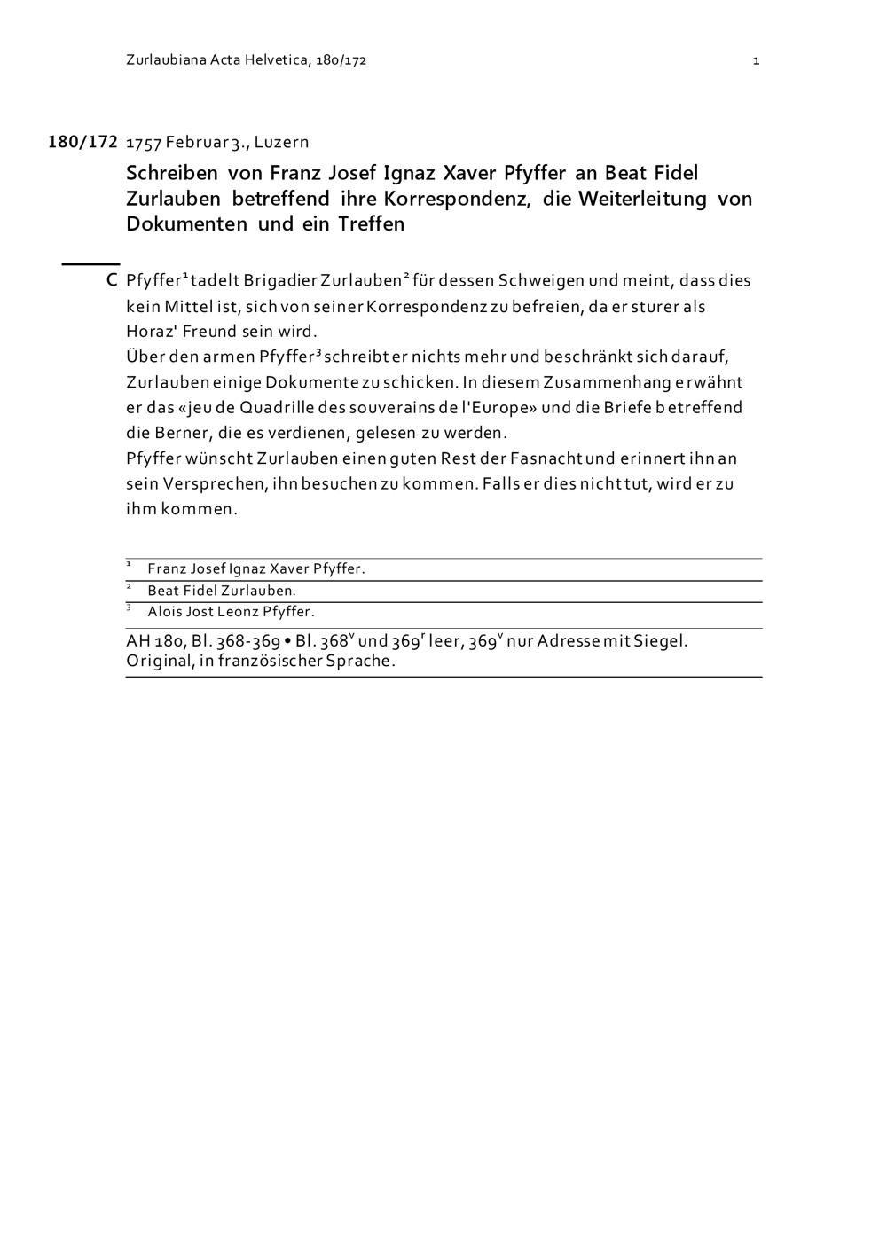 Schreiben von Franz Josef Ignaz Xaver Pfyffer an Beat Fidel Zurlauben betreffend...