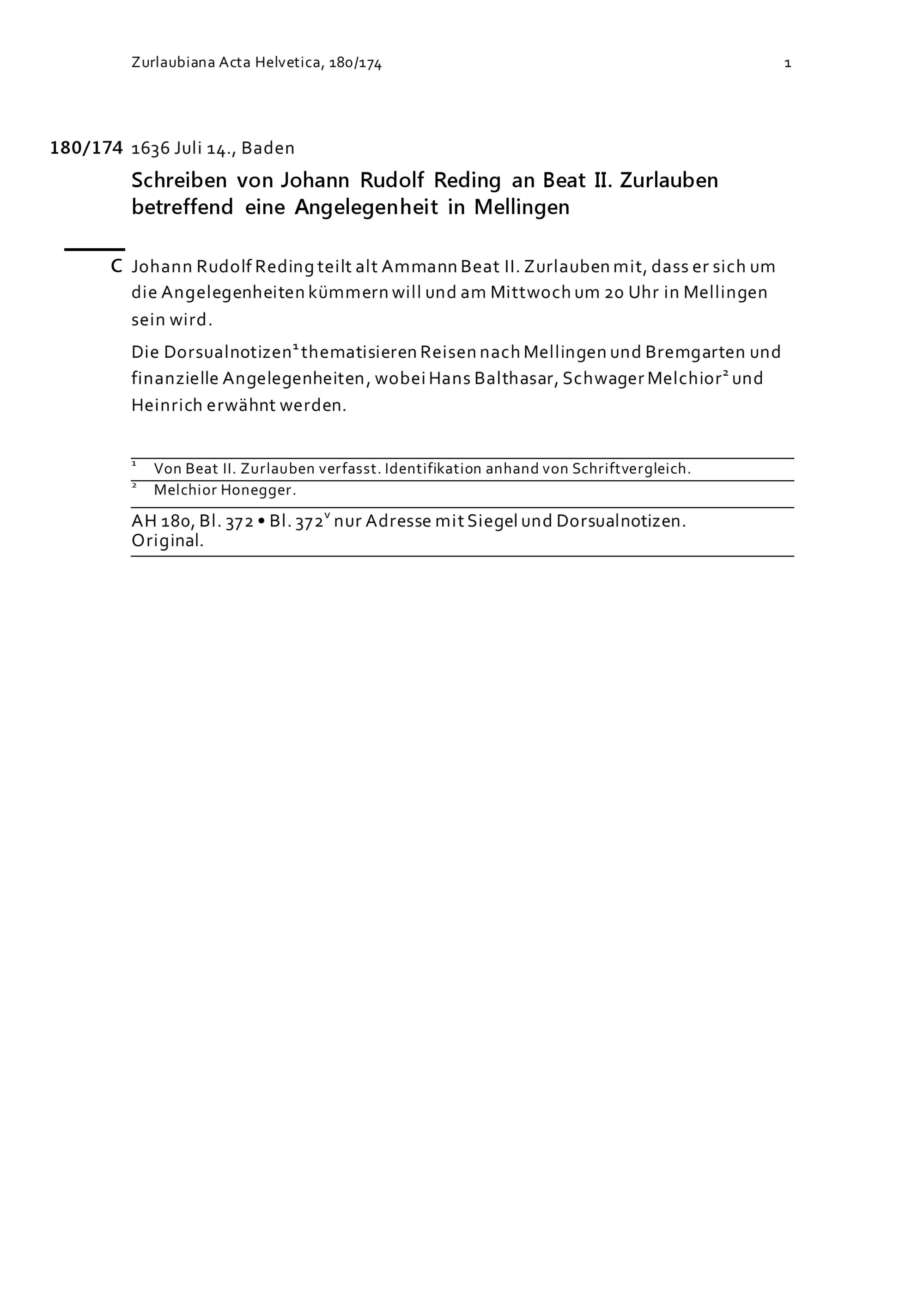 Schreiben von Johann Rudolf Reding an Beat II. Zurlauben betreffend eine Angelegenheit in Mellingen