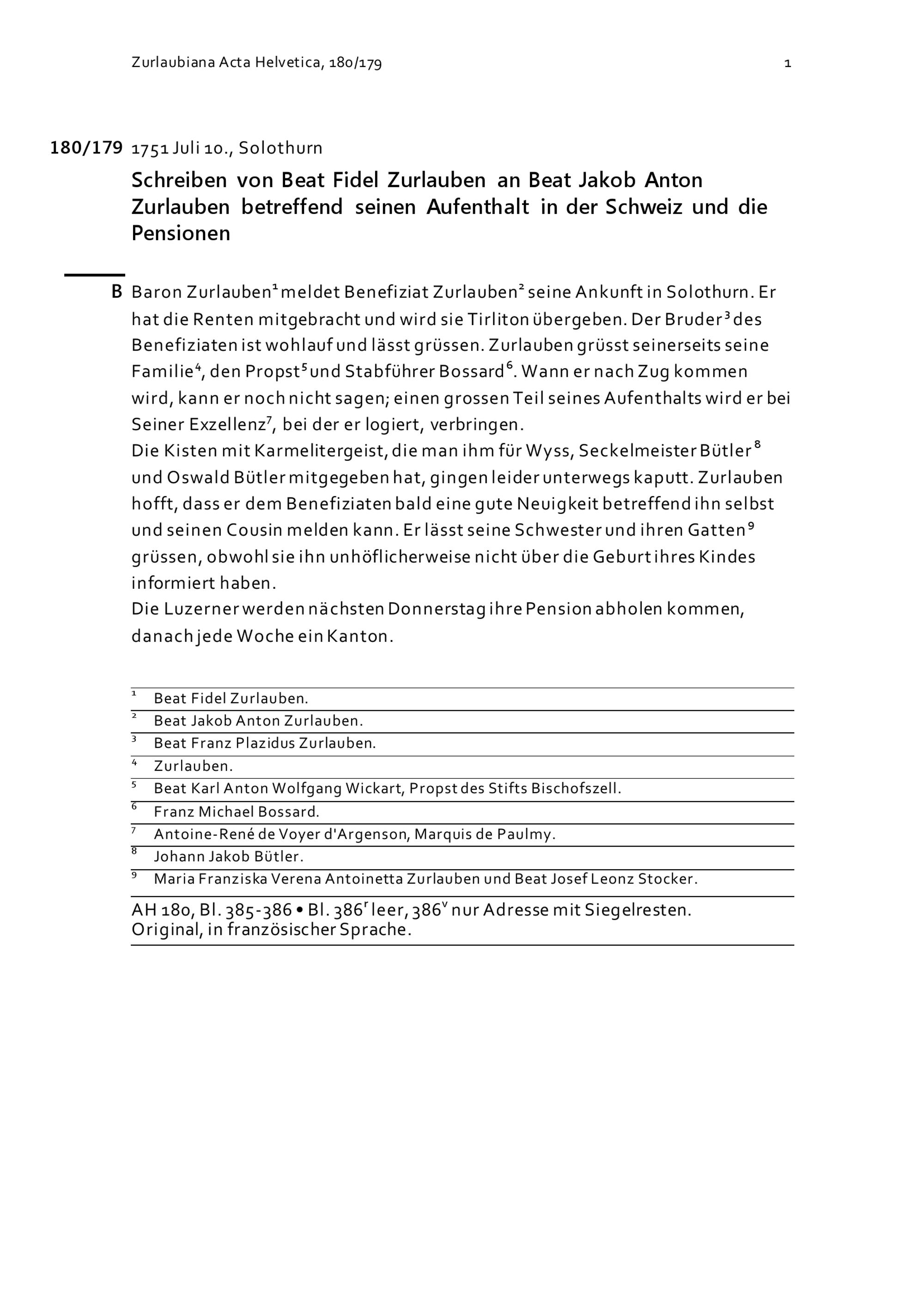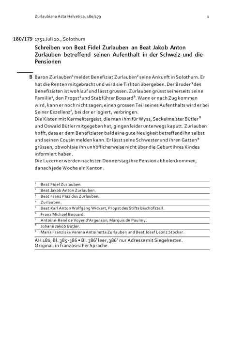 Schreiben von Beat Fidel Zurlauben an Beat Jakob Anton Zurlauben betreffend seinen Aufenthalt in der Schweiz und die Pensionen