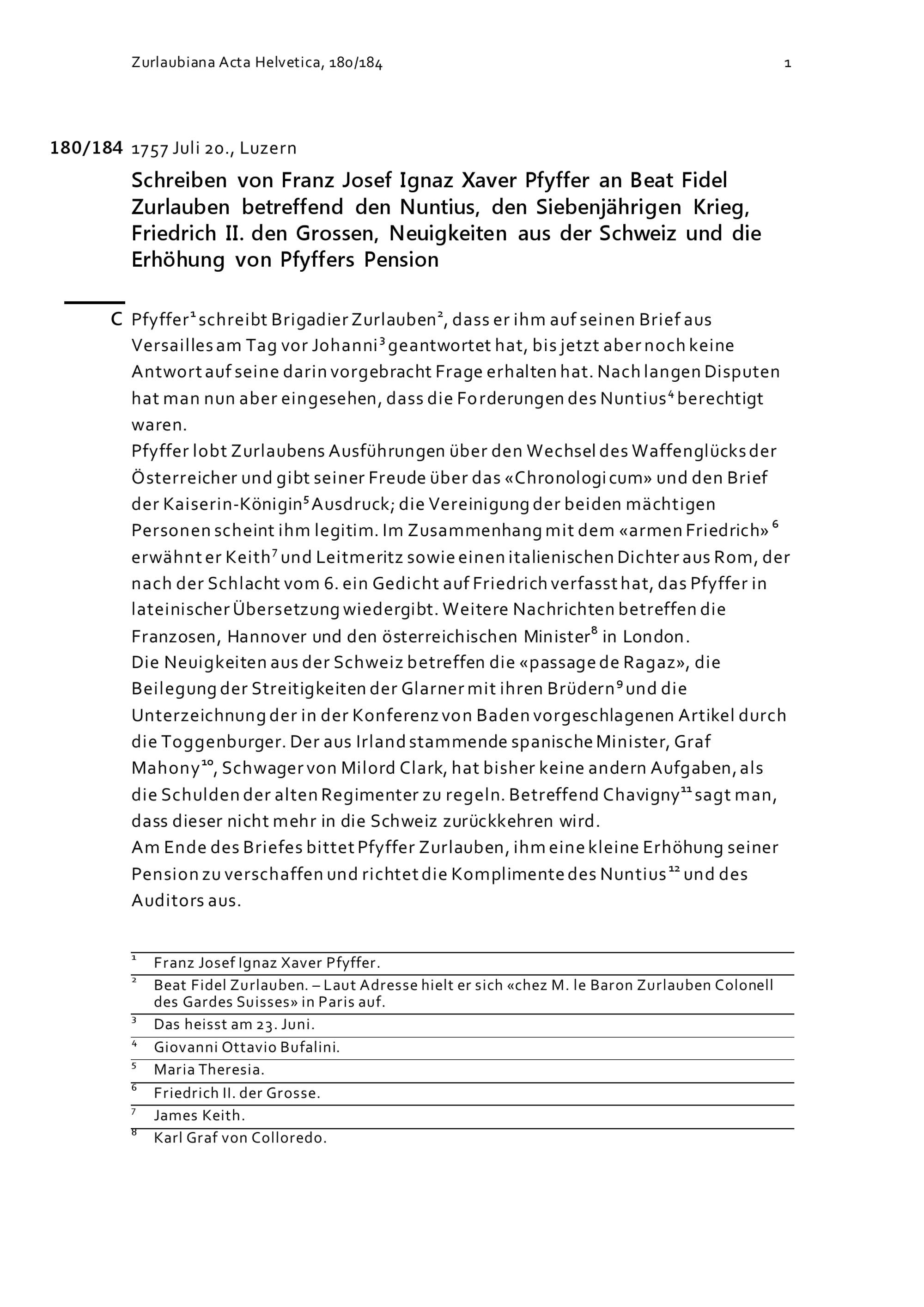Schreiben von Franz Josef Ignaz Xaver Pfyffer an Beat Fidel Zurlauben betreffend den Nuntius, den Siebenjährigen Krieg, Friedrich II. den Grossen, Neuigkeiten aus der Schweiz und die Erhöhung von Pfyffers Pension