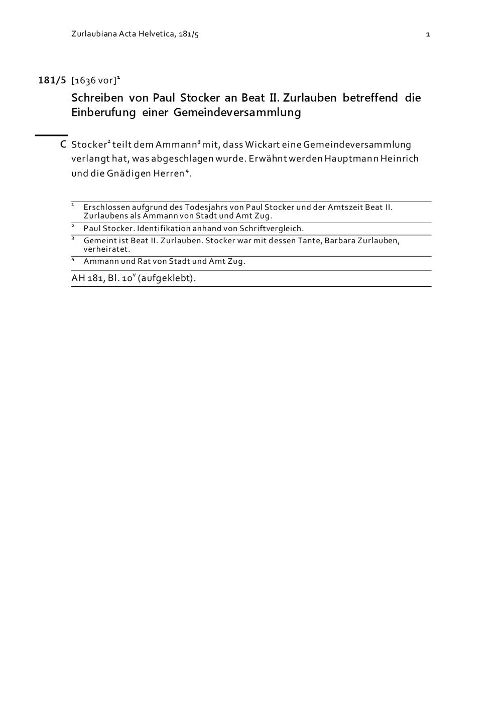 Schreiben von Paul Stocker an Beat II. Zurlauben betreffend die Einberufung einer...