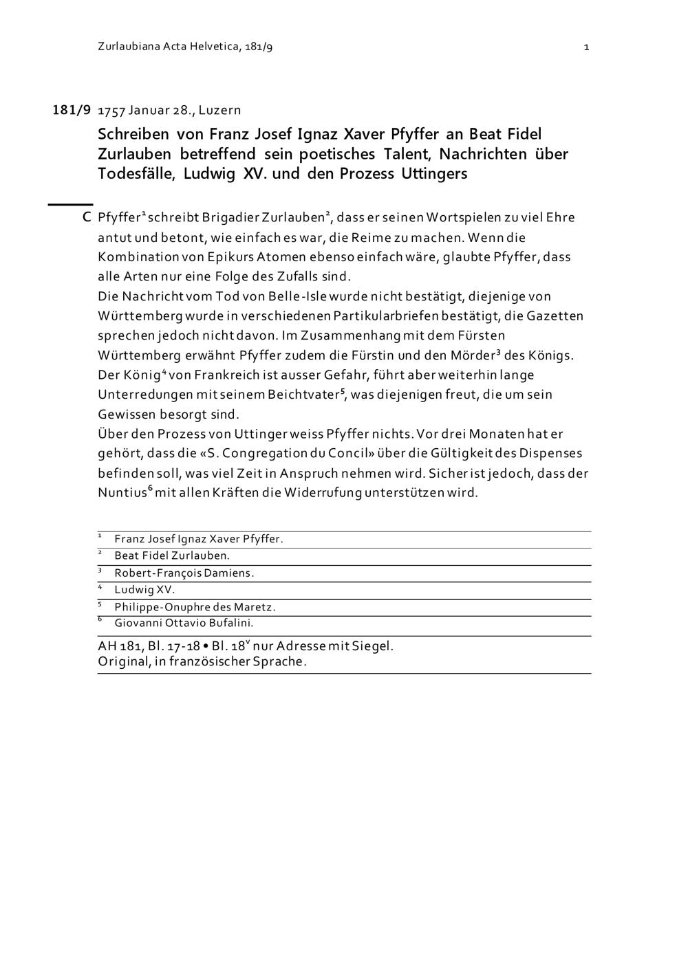 Schreiben von Franz Josef Ignaz Xaver Pfyffer an Beat Fidel Zurlauben betreffend...
