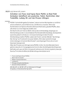 Schreiben von Franz Josef Ignaz Xaver Pfyffer an Beat Fidel Zurlauben betreffend sein poetisches Talent, Nachrichten über Todesfälle, Ludwig XV. und den Prozess Uttingers
