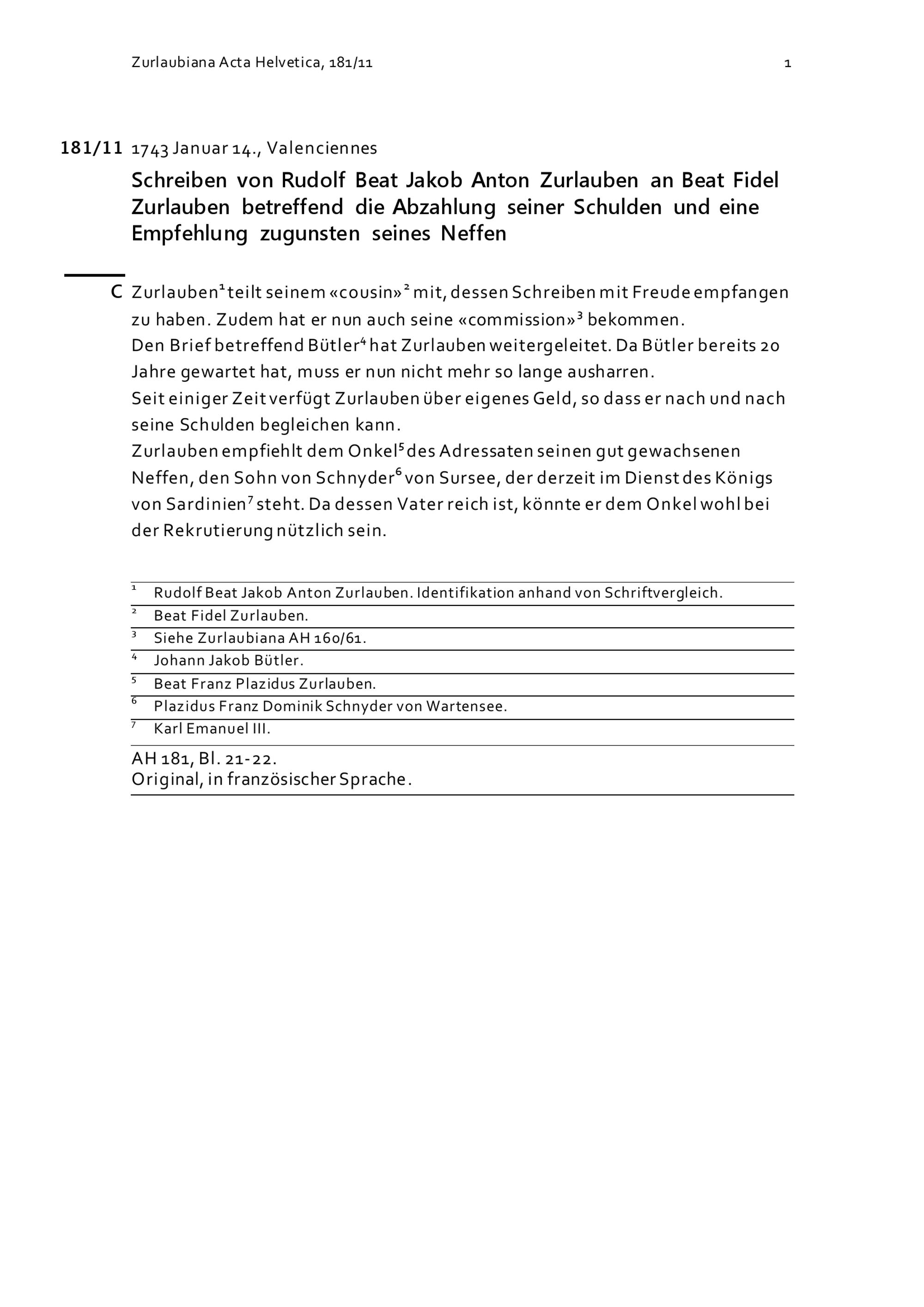 Schreiben von Rudolf Beat Jakob Anton Zurlauben an Beat Fidel Zurlauben betreffend die Abzahlung seiner Schulden und eine Empfehlung zugunsten seines Neffen