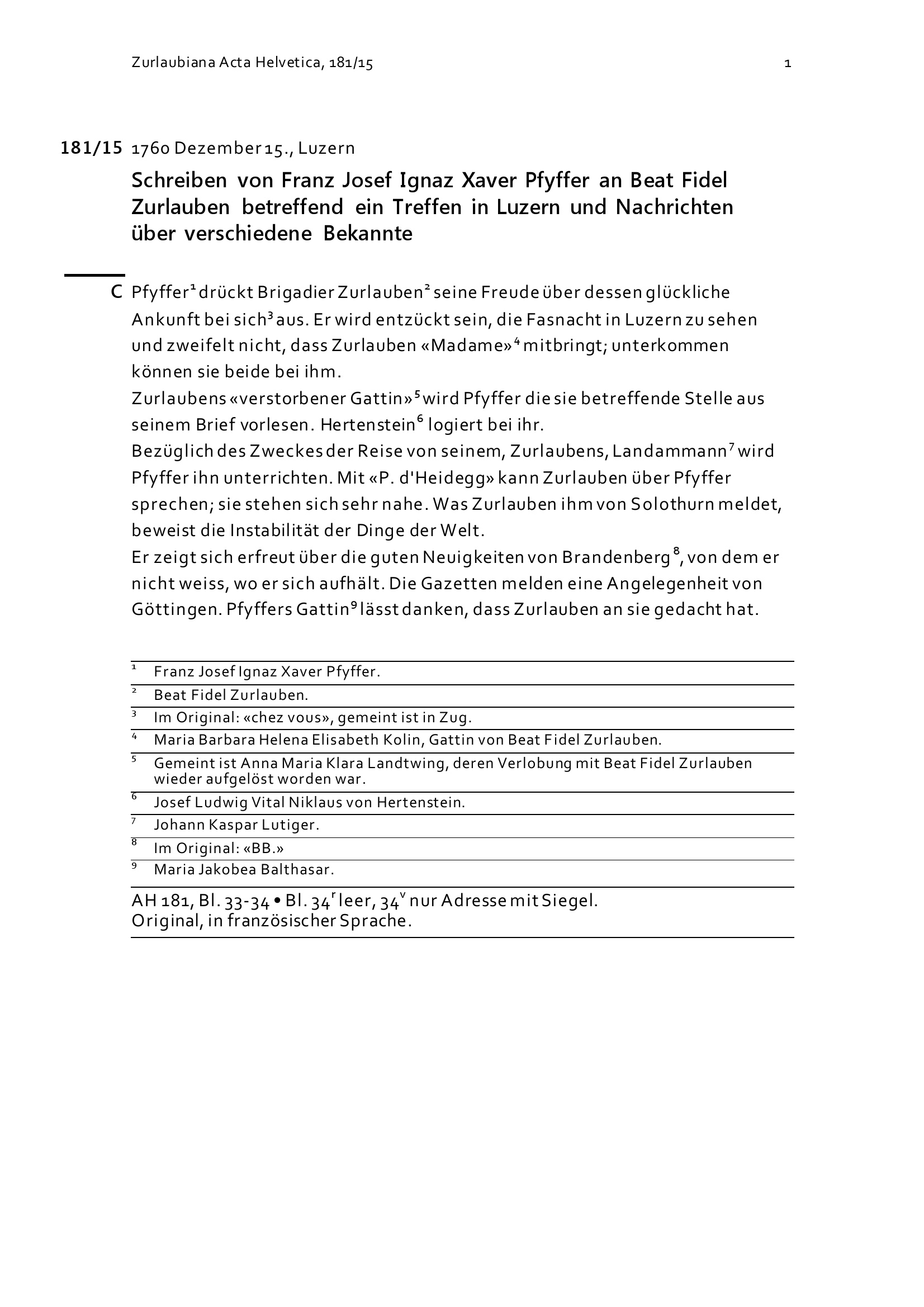Schreiben von Franz Josef Ignaz Xaver Pfyffer an Beat Fidel Zurlauben betreffend...