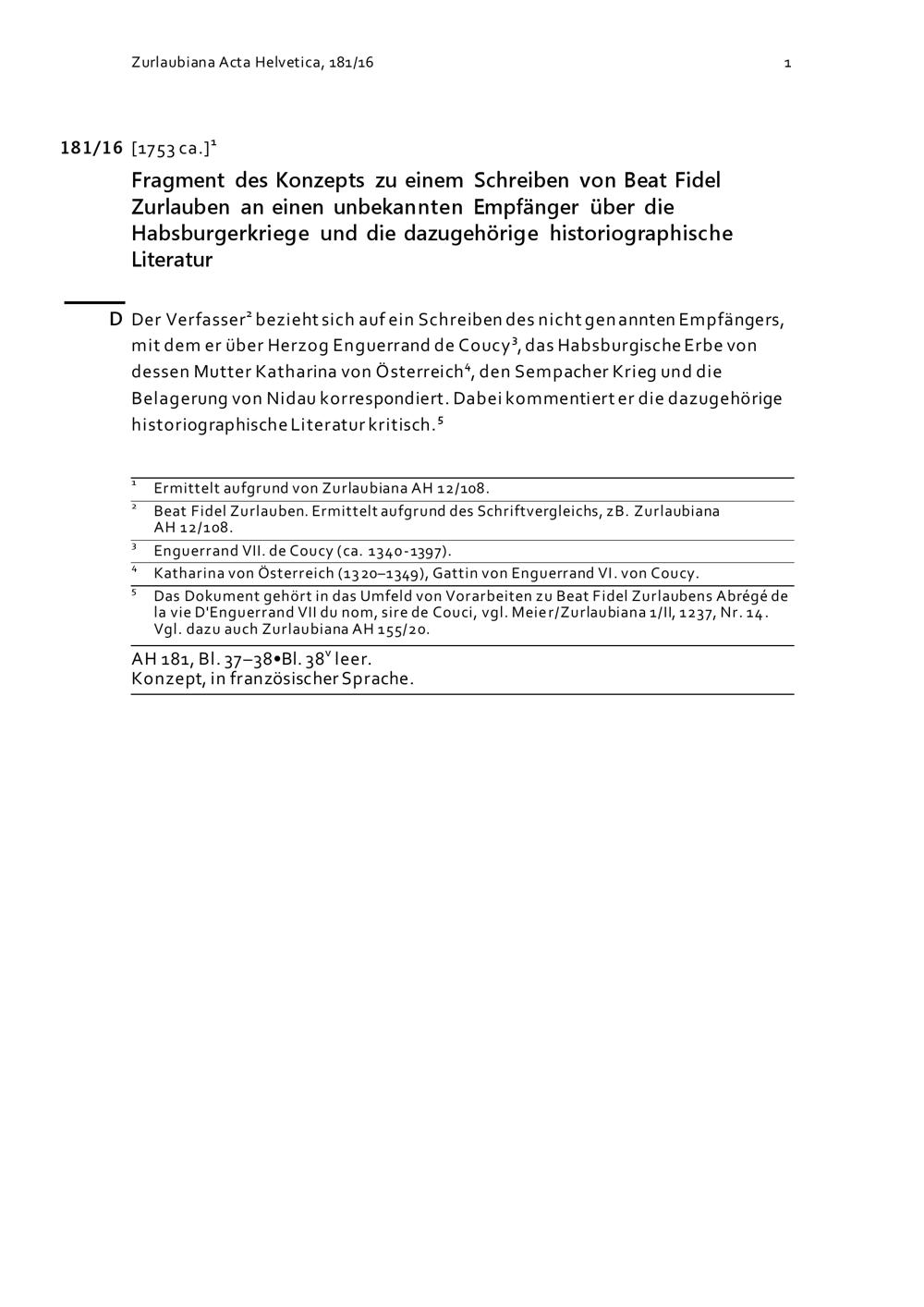 Fragment des Konzepts zu einem Schreiben von Beat Fidel Zurlauben an einen Empfänger über die Habsburgerkriege und die dazugehörige historiografische Literatur