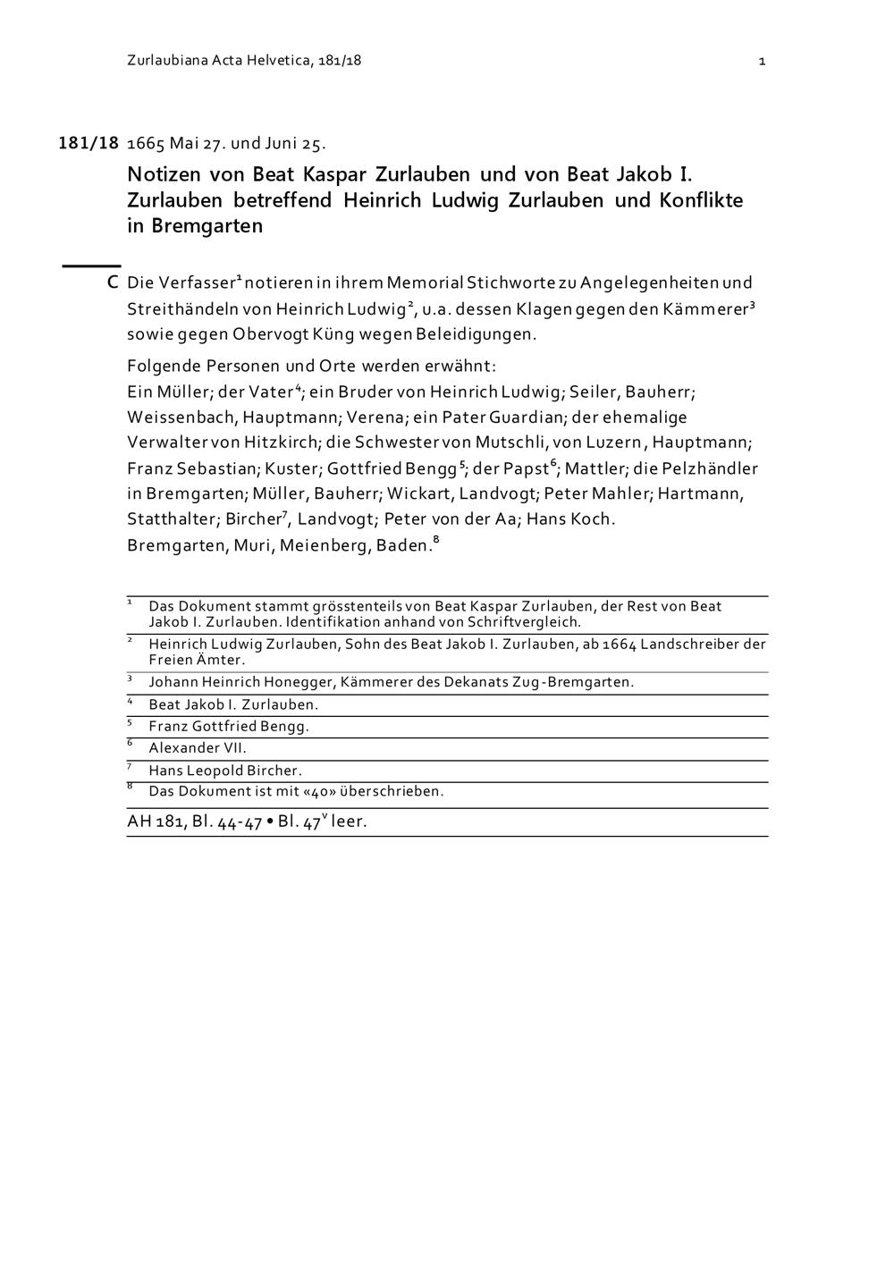 Notiz von Beat Kaspar Zurlauben und von Beat Jakob I. Zurlauben betreffend Heinrich Ludwig Zurlauben und Konflikte in Bremgarten