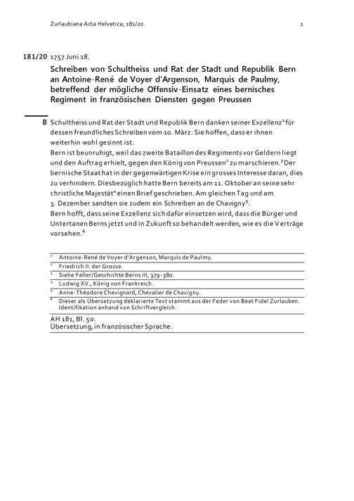 Schreiben des Schultheiss und Rats der Stadt und Republik Bern an Antoine-René de Voyer d'Argenson, Marquis de Paulmy, betreffend der mögliche Offensiv-Einsatz eines bernerisches Regiment in französischen Diensten gegen Preussen