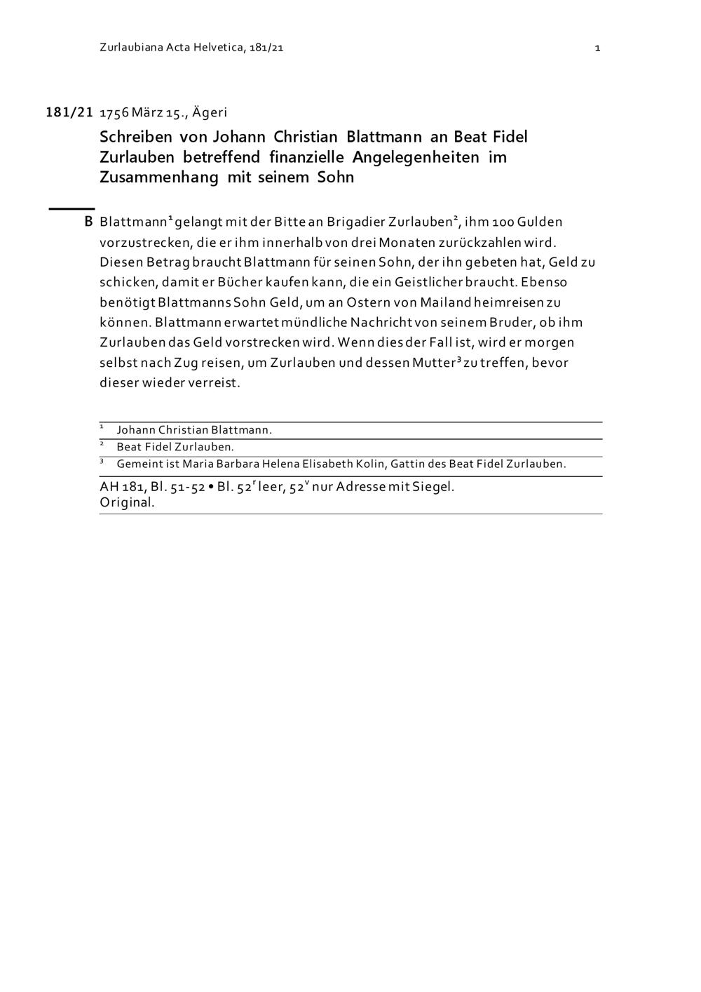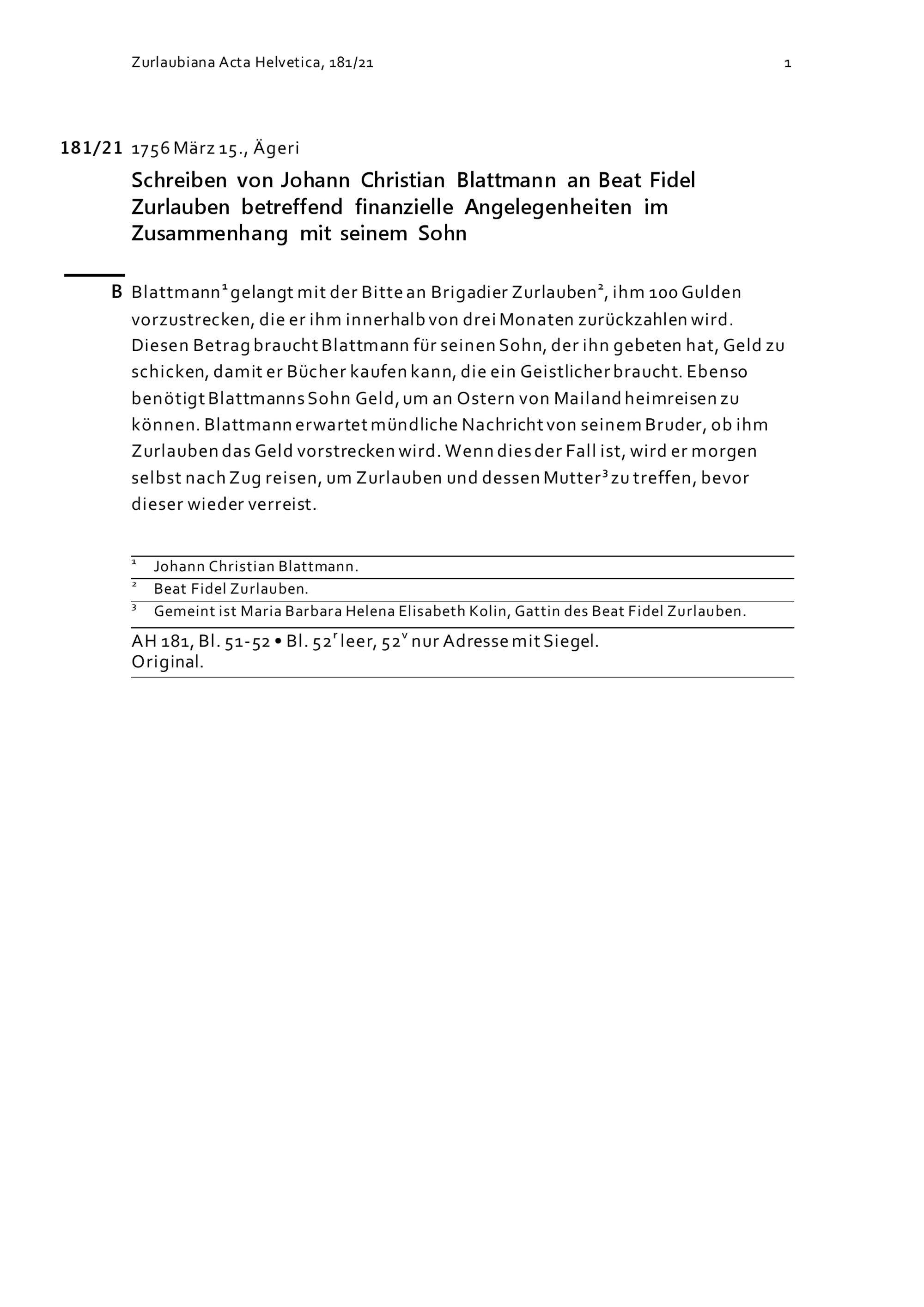 Schreiben von Johann Christian Blattmann an Beat Fidel Zurlauben betreffend finanzielle...
