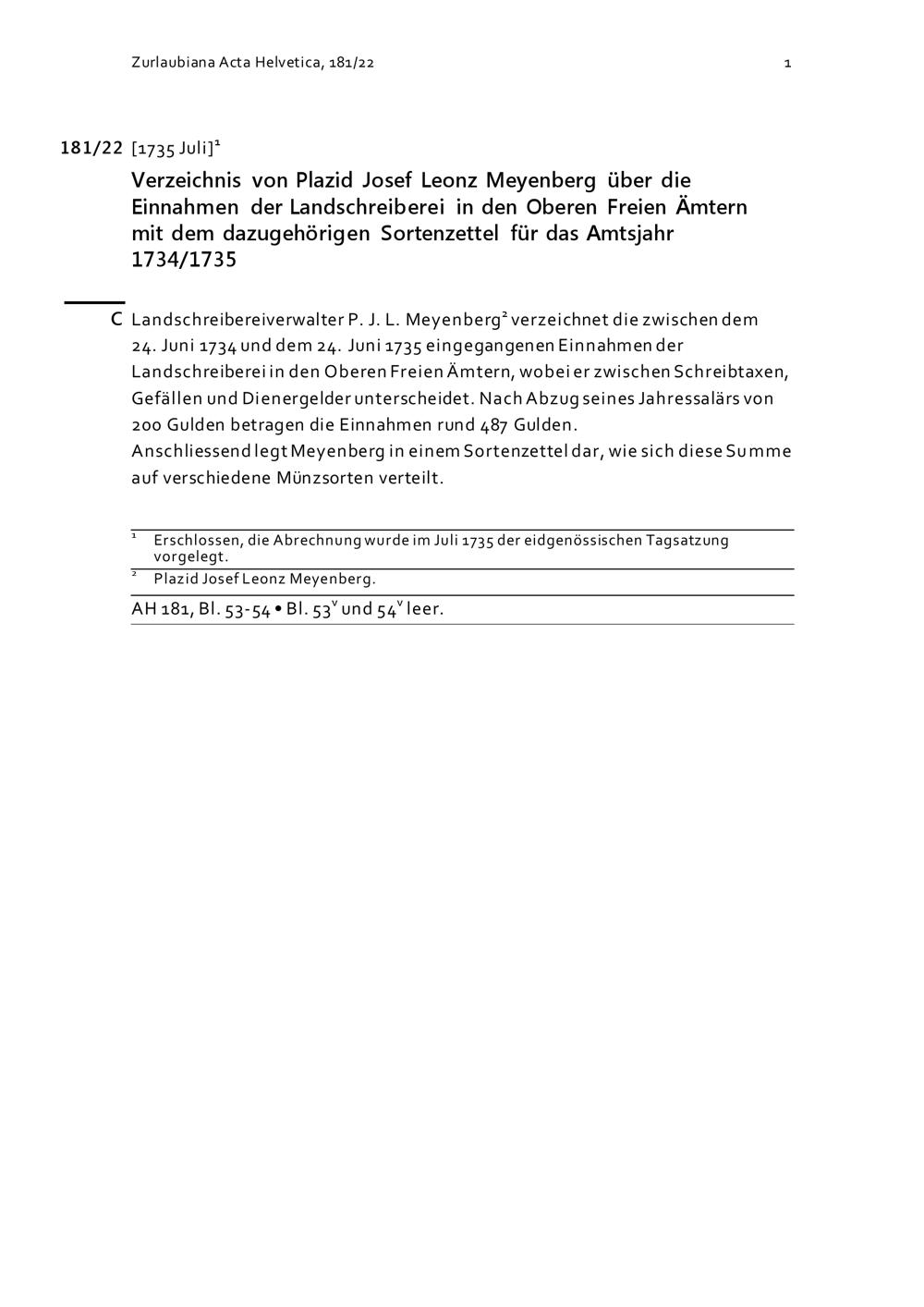 Verzeichnis von Plazid Josef Leonz Meyenberg über die Einnahmen der Landschreiberei in den Oberen Freien Ämter mit dem dazugehörigen Sortenzettel für das Amtsjahr 1734/1735