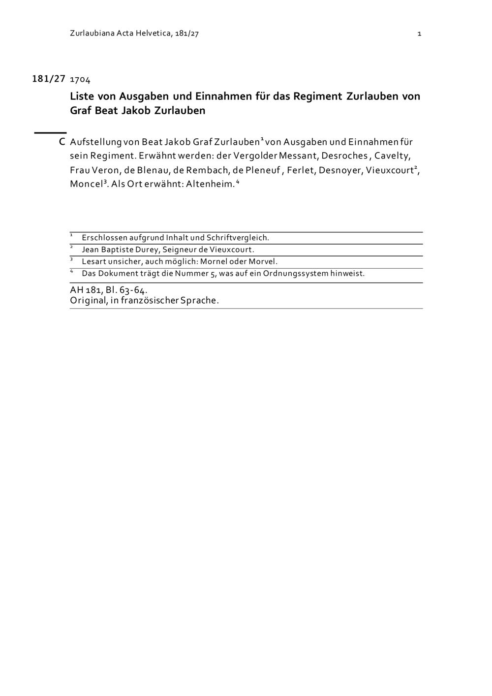 Ausgaben und Einnahmen für das Regiment Zurlauben von Beat Jakob Zurlauben