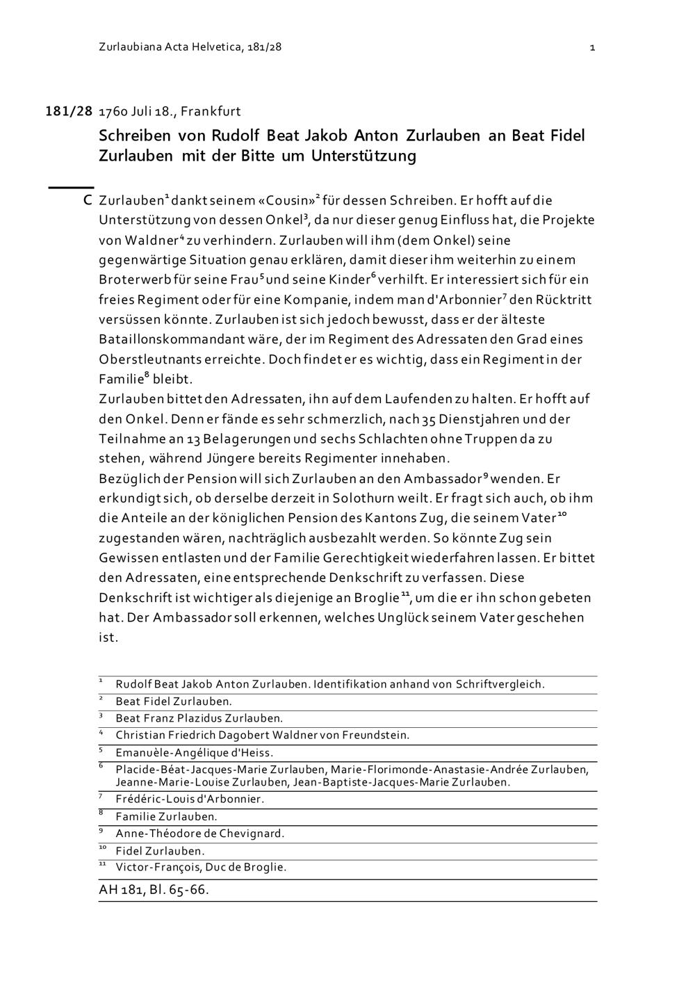 Schreiben von Rudolf Beat Jakob Anton Zurlauben an Beat Fidel Zurlauben mit der Bitte...