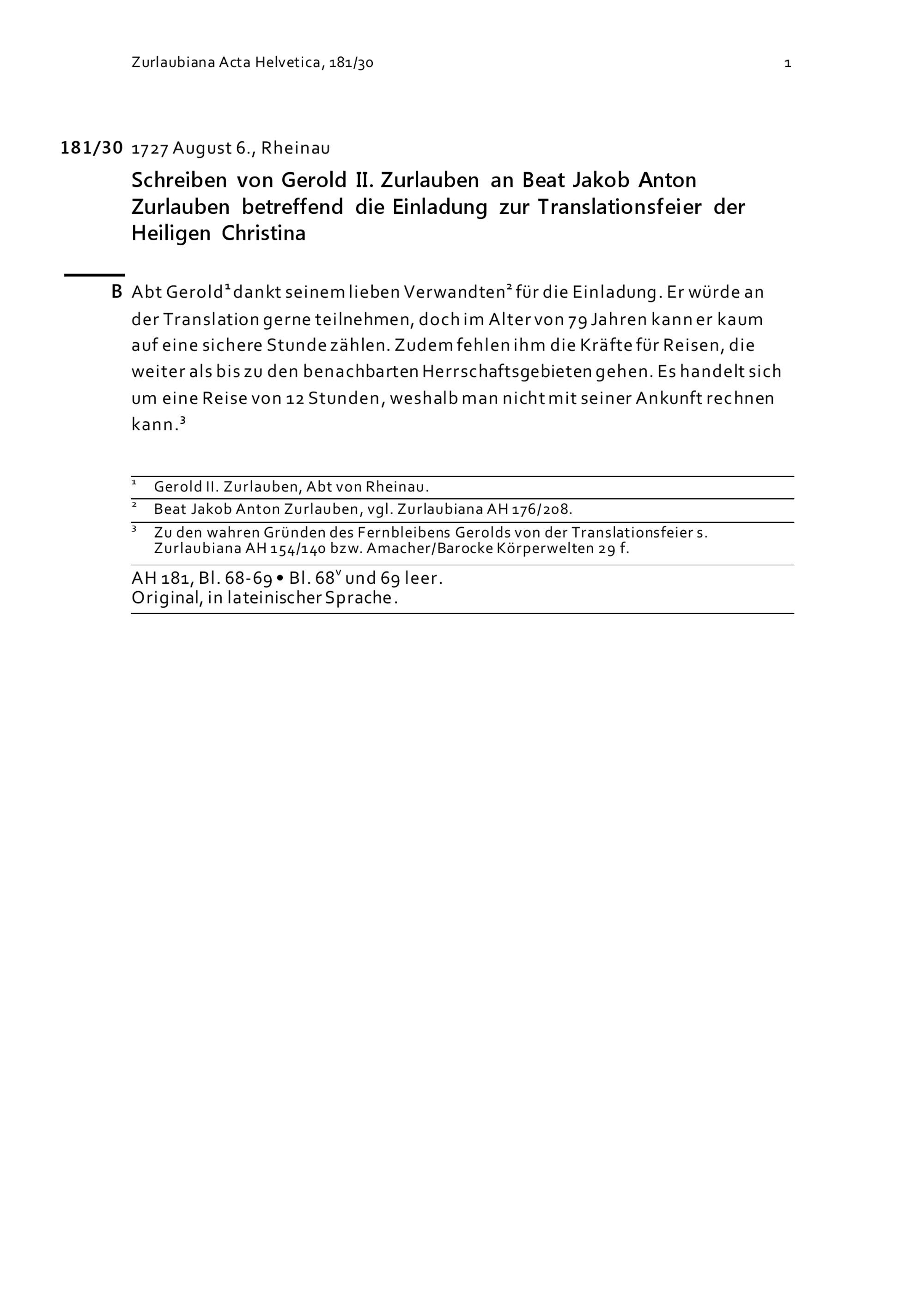 Schreiben von Gerold II. Zurlauben an Beat Jakob Anton Zurlauben betreffend Einladung zur Translationsfeier der Heiligen Christina