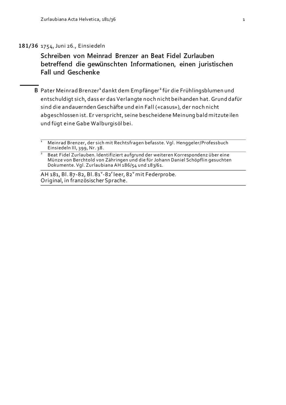 Schreiben von Meinrad Brenzer an Beat Fidel Zurlauben betreffend die gewünschten...