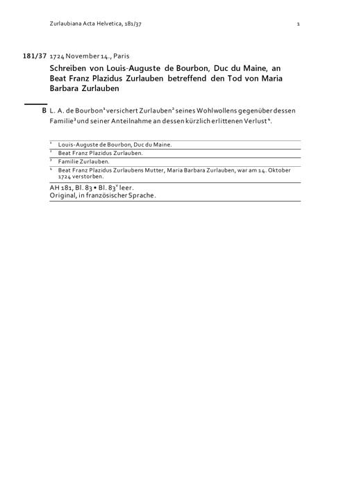 Schreiben von Louis-Auguste de Bourbon, Duc du Maine an Beat Franz Plazidus Zurlauben wegen des Todesfalls von Maria Barbara Zurlauben