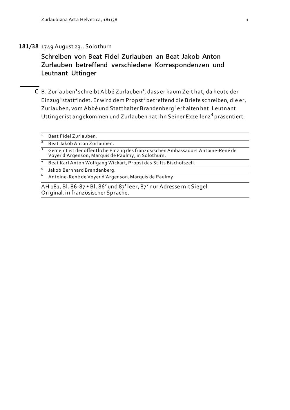 Schreiben von Beat Fidel Zurlauben an Beat Jakob Anton Zurlauben betreffend verschiedene Korrespondenzen und Leutnant Uttinger