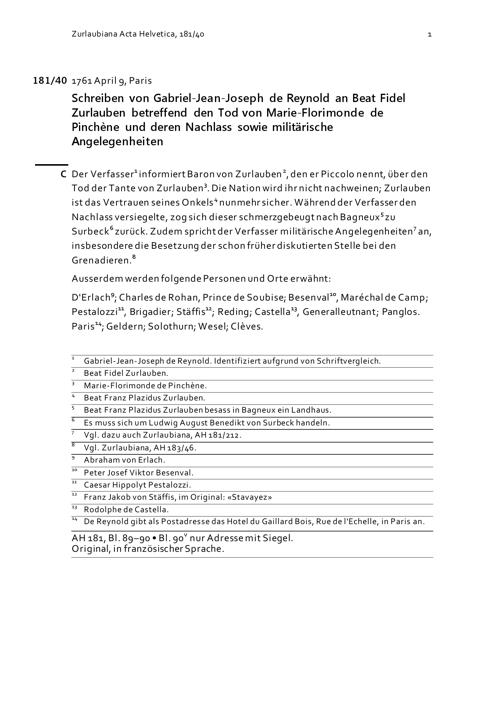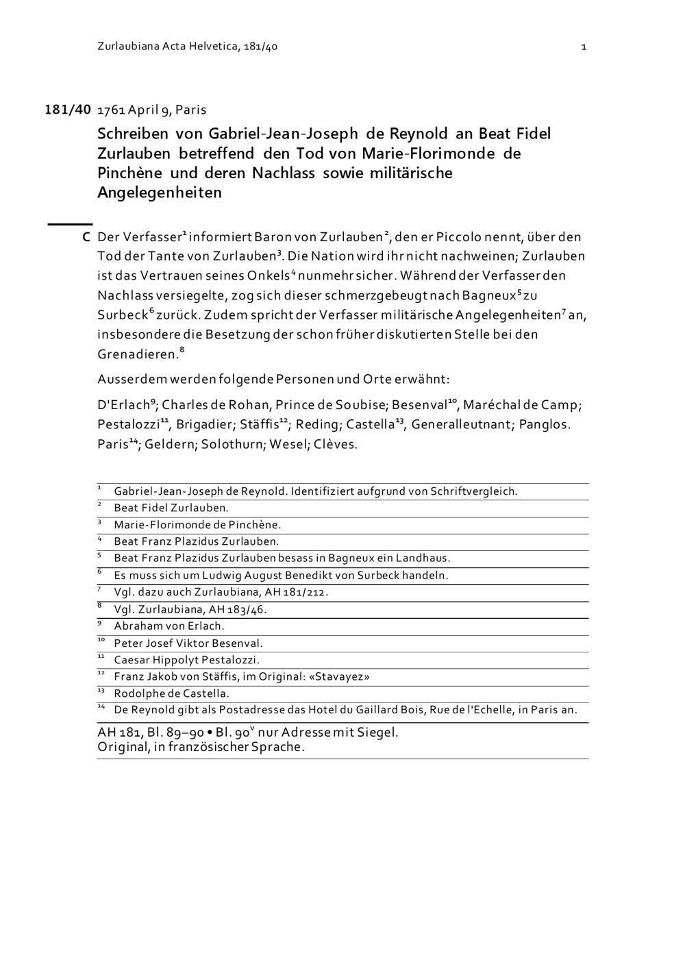 Schreiben von Gabriel-Jean-Joseph de Reynold an Beat Fidel Zurlauben betreffend den...