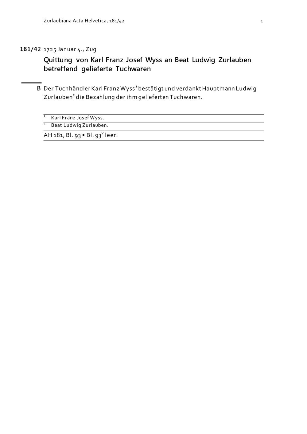 Quittung von Karl Franz Josef Wyss für Beat Ludwig Zurlauben betreffend gelieferte Tuchwaren