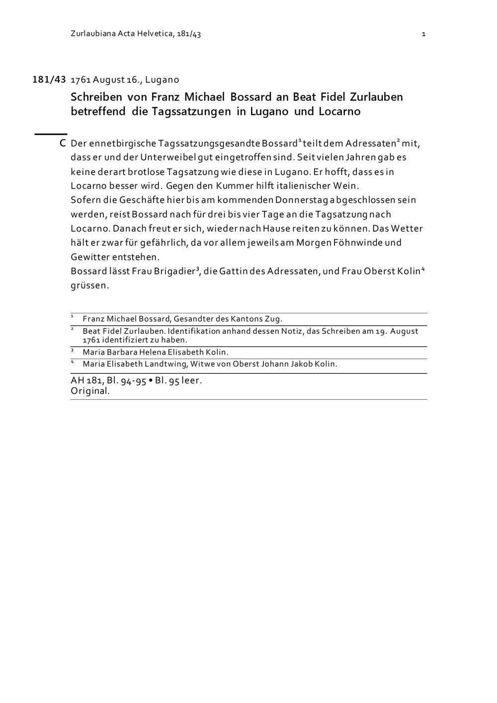 Schreiben von Franz Michael Bossard an Beat Fidel Zurlauben betreffend die Tagsatzungen in Lugano und Locarno