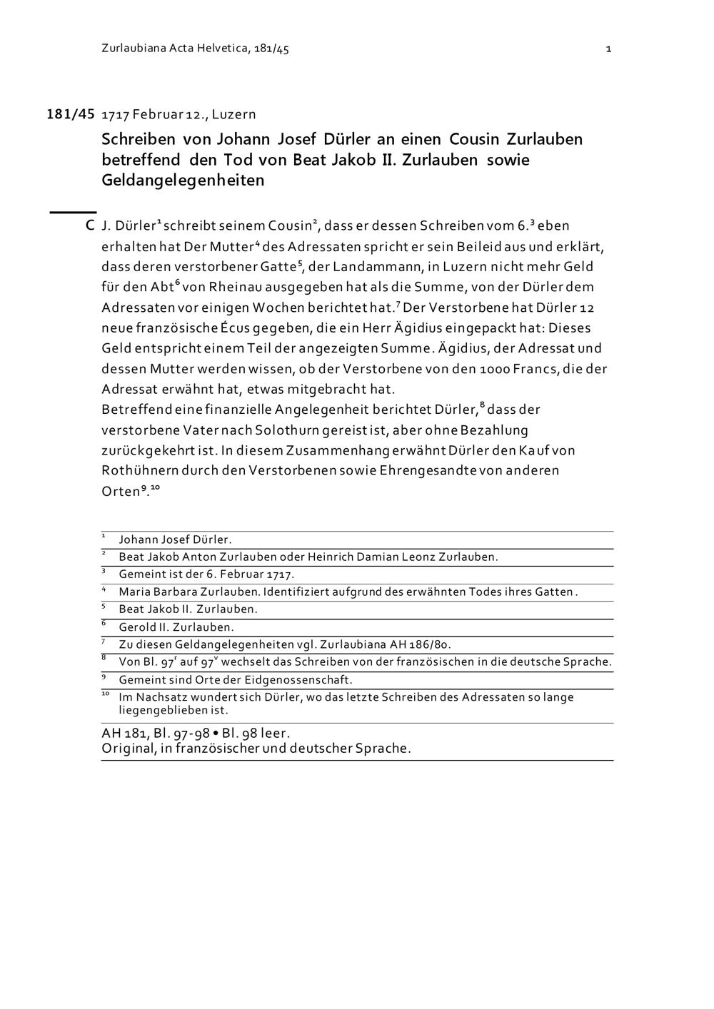 Schreiben von Johann Josef Dürler an einen Cousin Zurlauben betreffend den Tod von Beat Jakob II. Zurlauben sowie Geldangelegenheiten
