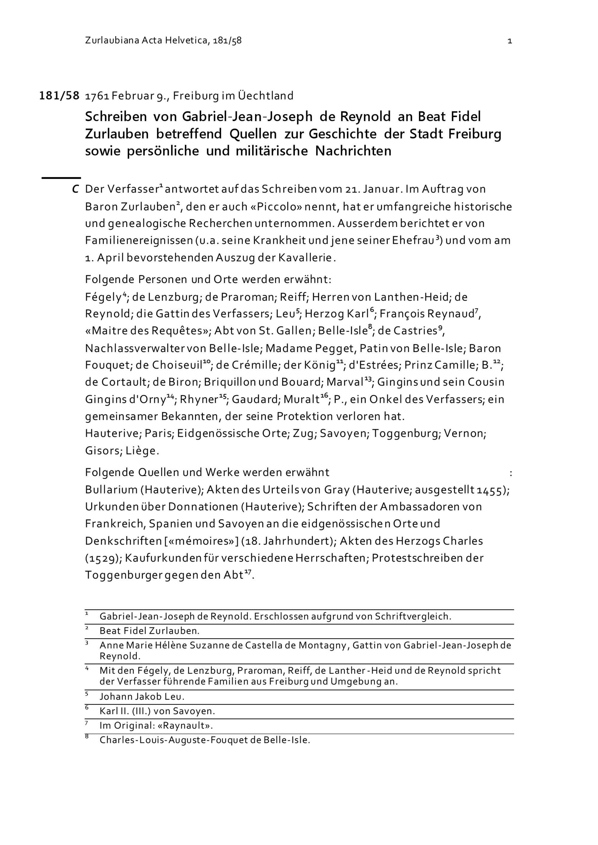 Schreiben von Gabriel-Jean-Joseph de Reynold an Beat Fidel Zurlauben betreffend Quellen...