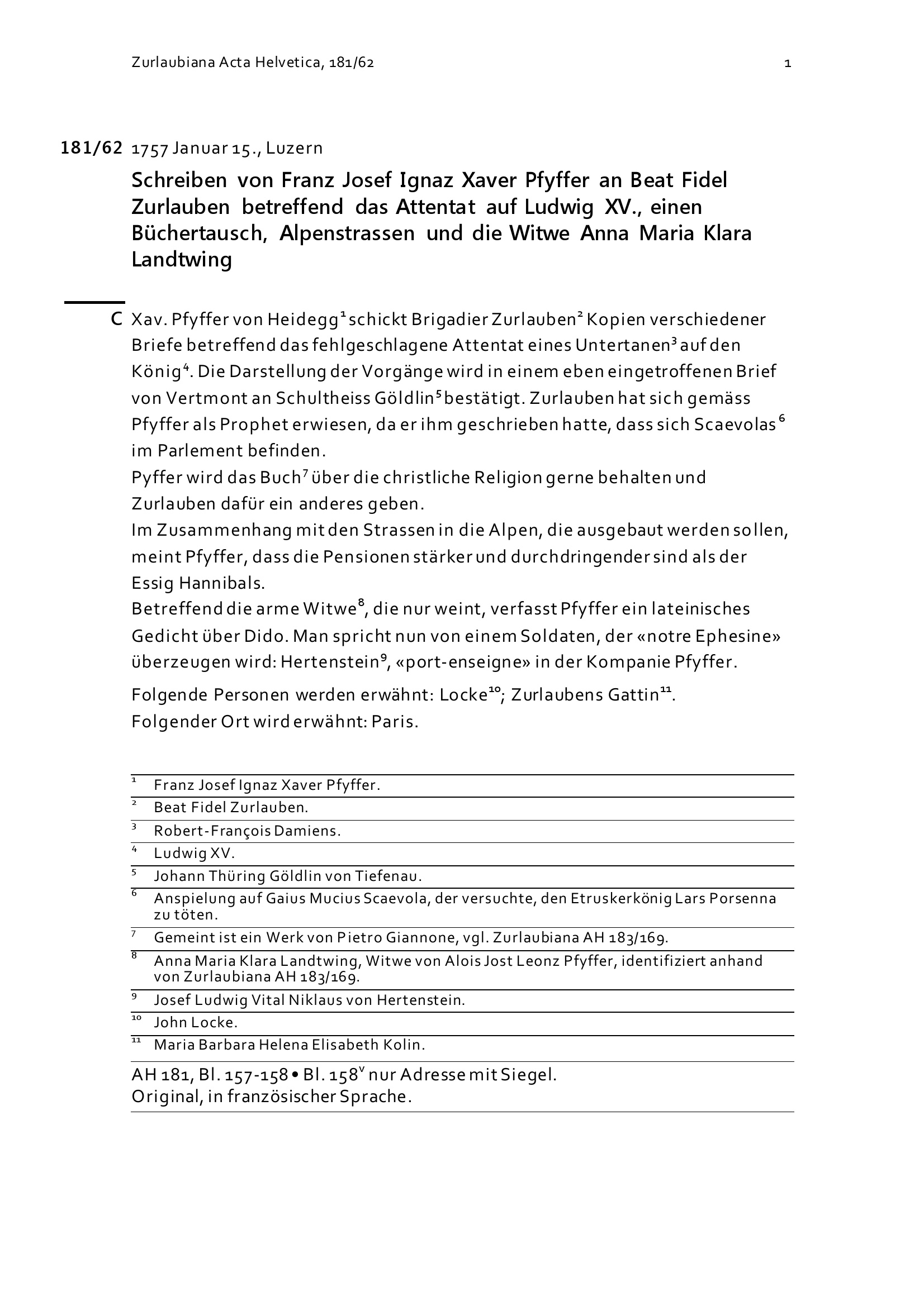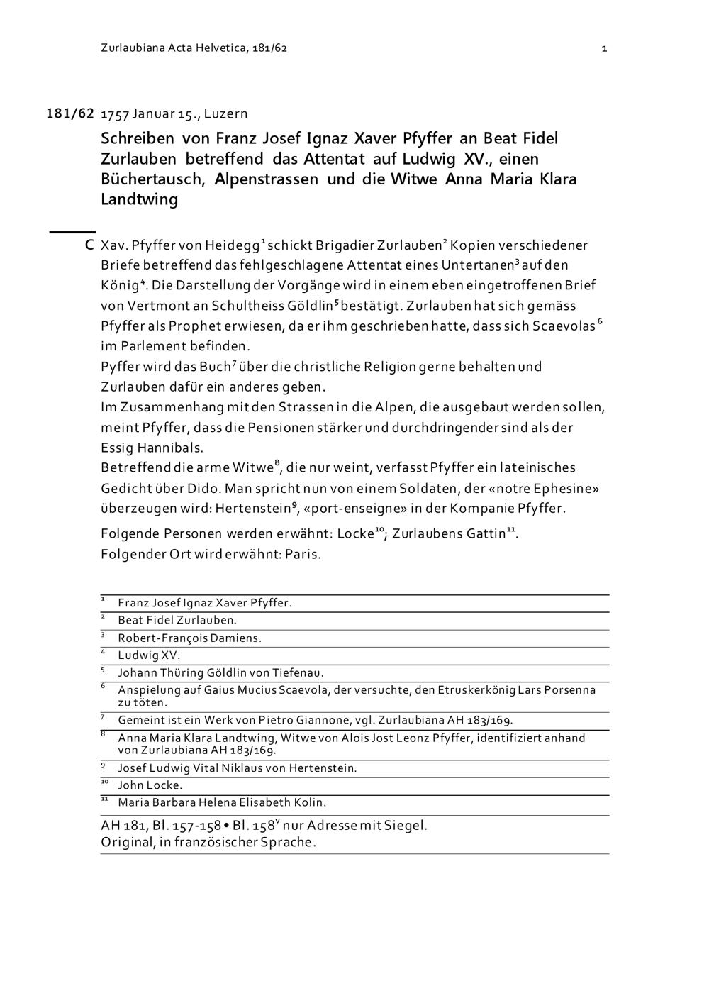 Schreiben von Franz Josef Ignaz Xaver Pfyffer an Beat Fidel Zurlauben betreffend das Attentat auf Ludwig XV., einen Büchertausch, Alpenstrassen und die Witwe Anna Maria Klara Landtwing