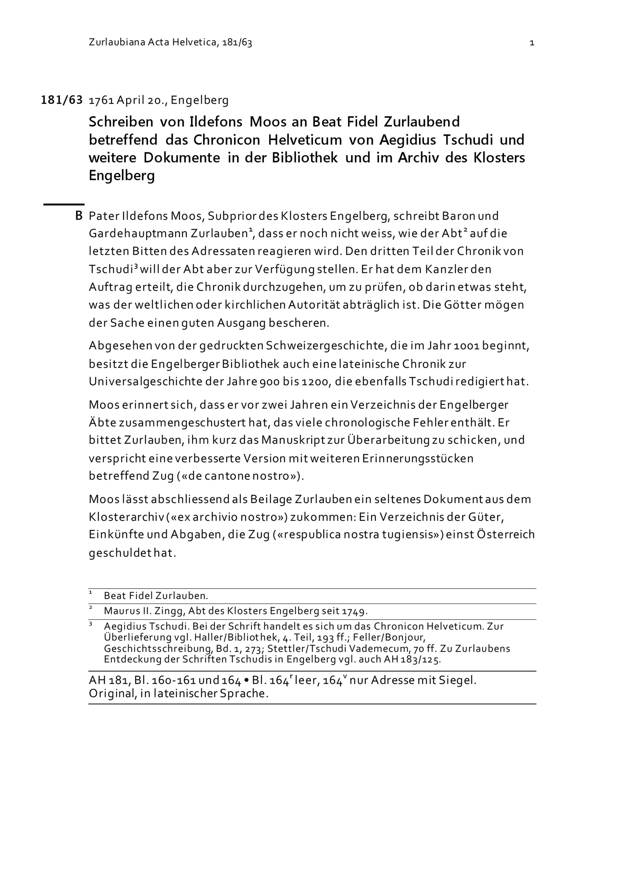 Schreiben von Ildefons Moos an Beat Fidel Zurlaubend betreffend das Chronicon Helveticum von Aegidius Tschudi und weitere Dokumente in der Bibliothek und im Archiv des Klosters Engelberg