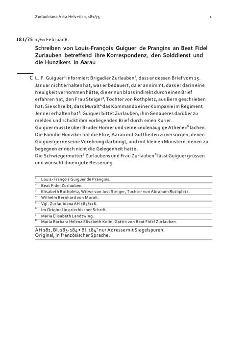 Schreiben von Louis-François Guiguer de Prangins an Beat Fidel Zurlauben betreffend...