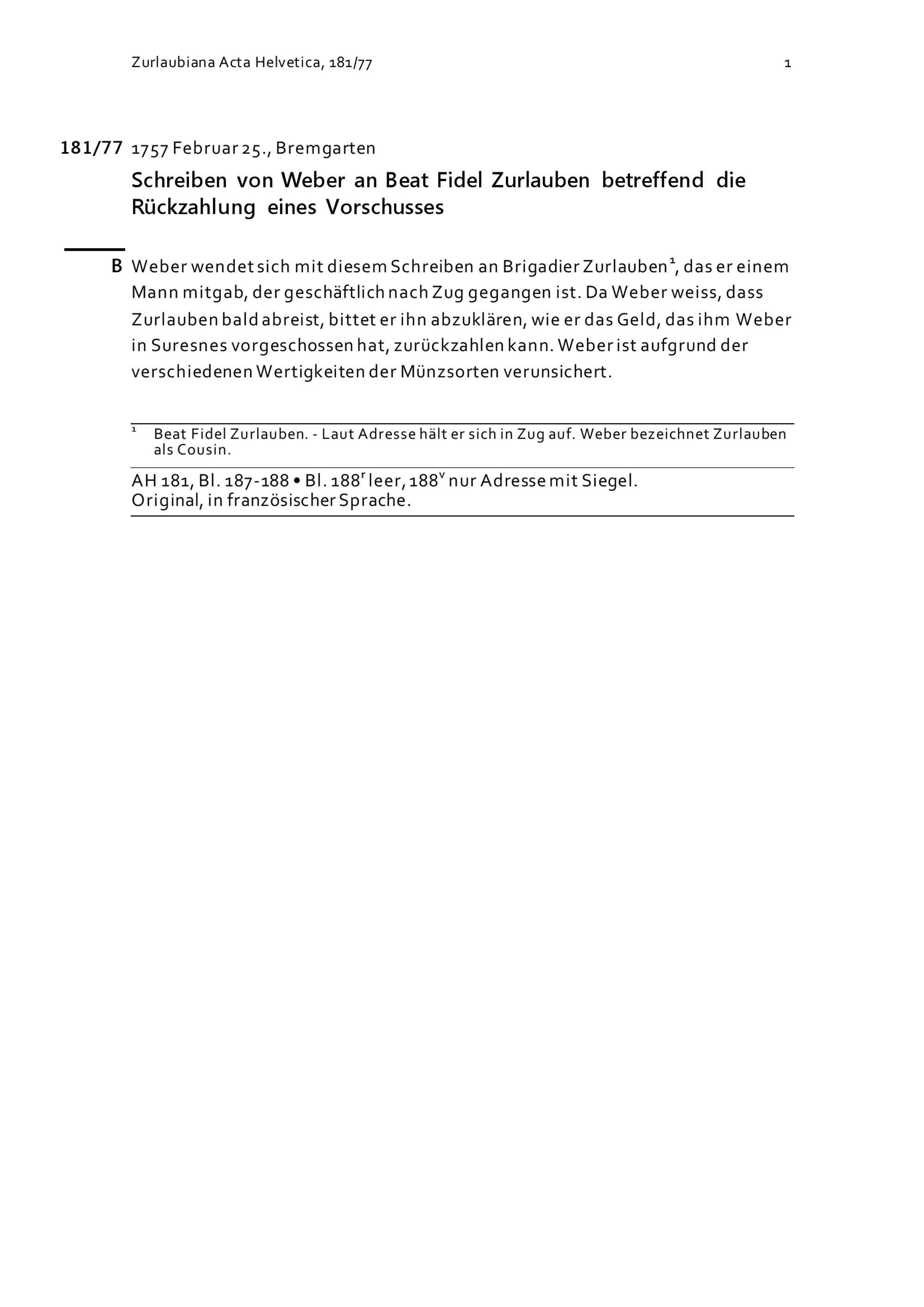 Schreiben von Weber an Beat Fidel Zurlauben betreffend die Rückzahlung eines Vorschusses